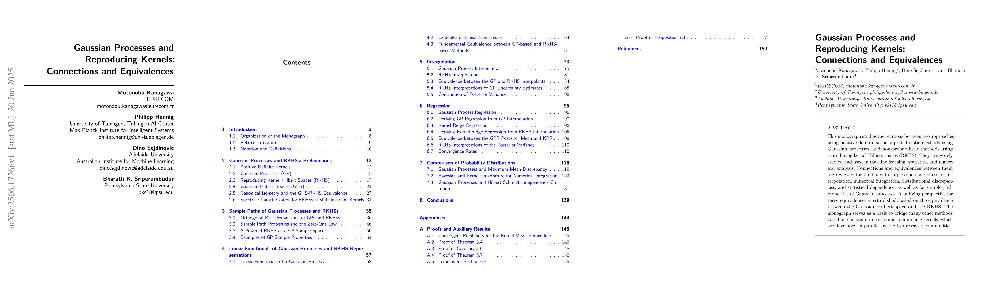 This monograph studies the relations between two approaches using positive definite kernels: probabilistic methods using Gaussian processes, and non-probabilistic methods using reproducing kernel Hilbert spaces (RKHS). They are widely studied and used in machine learning, statistics, and numerical analysis. Connections and equivalences between them are reviewed for fundamental topics such as regression, interpolation, numerical integration, distributional discrepancies, and statistical dependence, as well as for sample path properties of Gaussian processes. A unifying perspective for these equivalences is established, based on the equivalence between the Gaussian Hilbert space and the RKHS. The monograph serves as a basis to bridge many other methods based on Gaussian processes and reproducing kernels, which are developed in parallel by the two research communities.