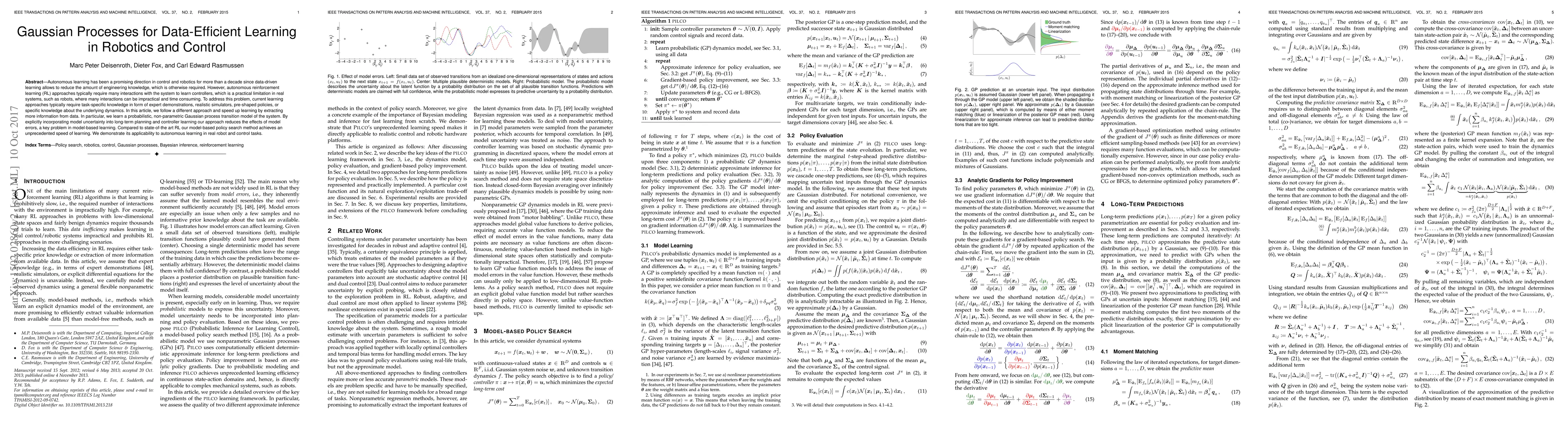 Autonomous learning has been a promising direction in control and robotics for more than a decade since data-driven learning allows to reduce the amount of engineering knowledge, which is otherwise required. However, autonomous reinforcement learning (RL) approaches typically require many interactions with the system to learn controllers, which is a practical limitation in real systems, such as robots, where many interactions can be impractical and time consuming. To address this problem, current learning approaches typically require task-specific knowledge in form of expert demonstrations, realistic simulators, pre-shaped policies, or specific knowledge about the underlying dynamics. In this article, we follow a different approach and speed up learning by extracting more information from data. In particular, we learn a probabilistic, non-parametric Gaussian process transition model of the system. By explicitly incorporating model uncertainty into long-term planning and controller learning our approach reduces the effects of model errors, a key problem in model-based learning. Compared to state-of-the art RL our model-based policy search method achieves an unprecedented speed of learning. We demonstrate its applicability to autonomous learning in real robot and control tasks.