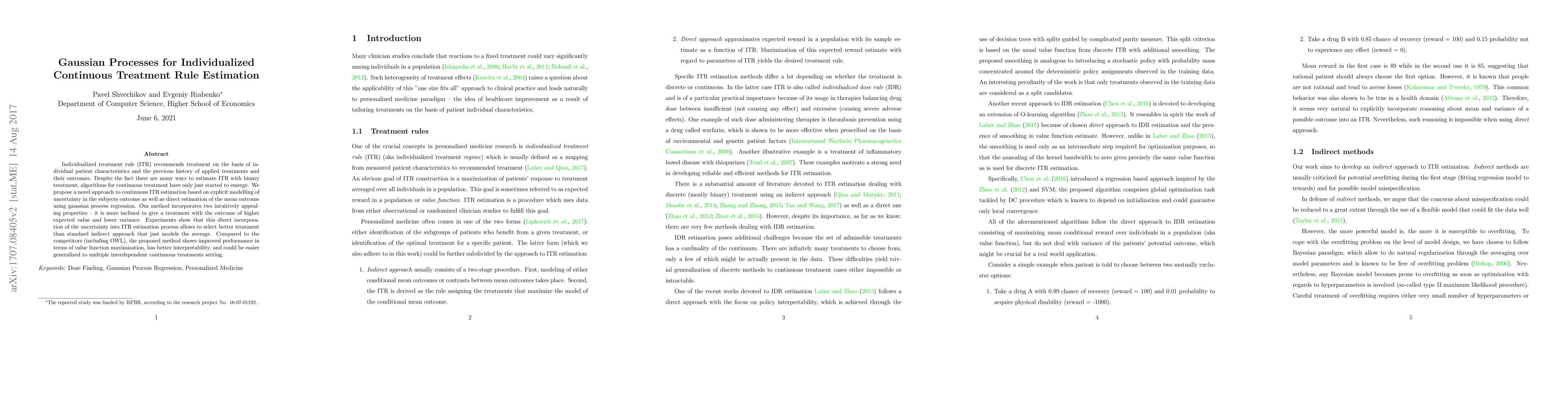 Individualized treatment rule (ITR) recommends treatment on the basis of individual patient characteristics and the previous history of applied treatments and their outcomes. Despite the fact there are many ways to estimate ITR with binary treatment, algorithms for continuous treatment have only just started to emerge. We propose a novel approach to continuous ITR estimation based on explicit modelling of uncertainty in the subject's outcome as well as direct estimation of the mean outcome using gaussian process regression. Our method incorporates two intuitively appealing properties - it is more inclined to give a treatment with the outcome of higher expected value and lower variance. Experiments show that this direct incorporation of the uncertainty into ITR estimation process allows to select better treatment than standard indirect approach that just models the average. Compared to the competitors (including OWL), the proposed method shows improved performance in terms of value function maximization, has better interpretability, and could be easier generalized to multiple interdependent continuous treatments setting.