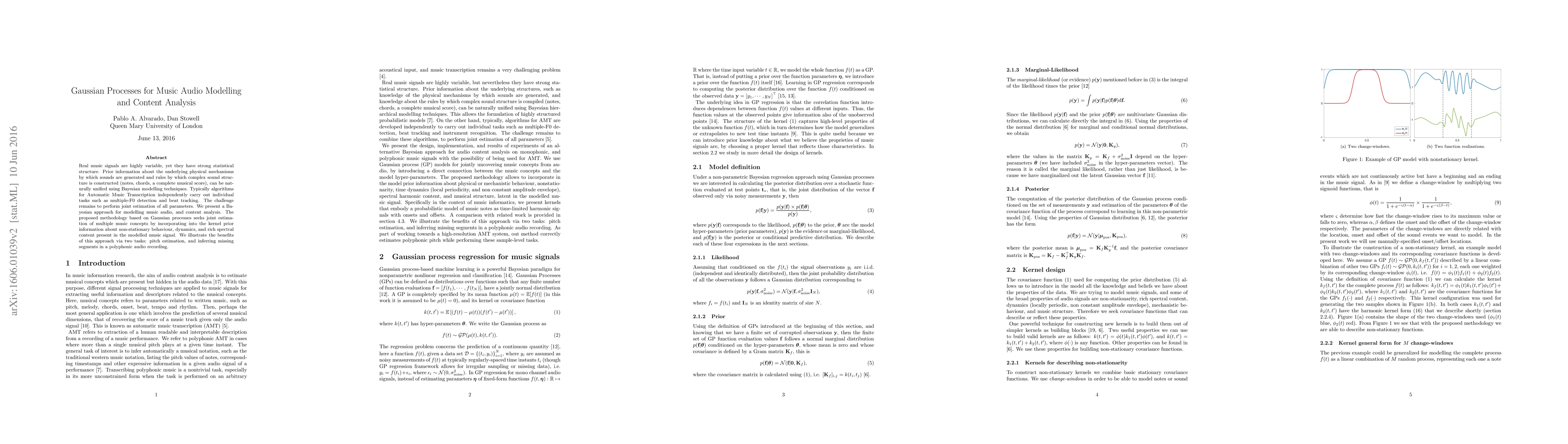 Real music signals are highly variable, yet they have strong statistical structure. Prior information about the underlying physical mechanisms by which sounds are generated and rules by which complex sound structure is constructed (notes, chords, a complete musical score), can be naturally unified using Bayesian modelling techniques. Typically algorithms for Automatic Music Transcription independently carry out individual tasks such as multiple-F0 detection and beat tracking. The challenge remains to perform joint estimation of all parameters. We present a Bayesian approach for modelling music audio, and content analysis. The proposed methodology based on Gaussian processes seeks joint estimation of multiple music concepts by incorporating into the kernel prior information about non-stationary behaviour, dynamics, and rich spectral content present in the modelled music signal. We illustrate the benefits of this approach via two tasks: pitch estimation, and inferring missing segments in a polyphonic audio recording.