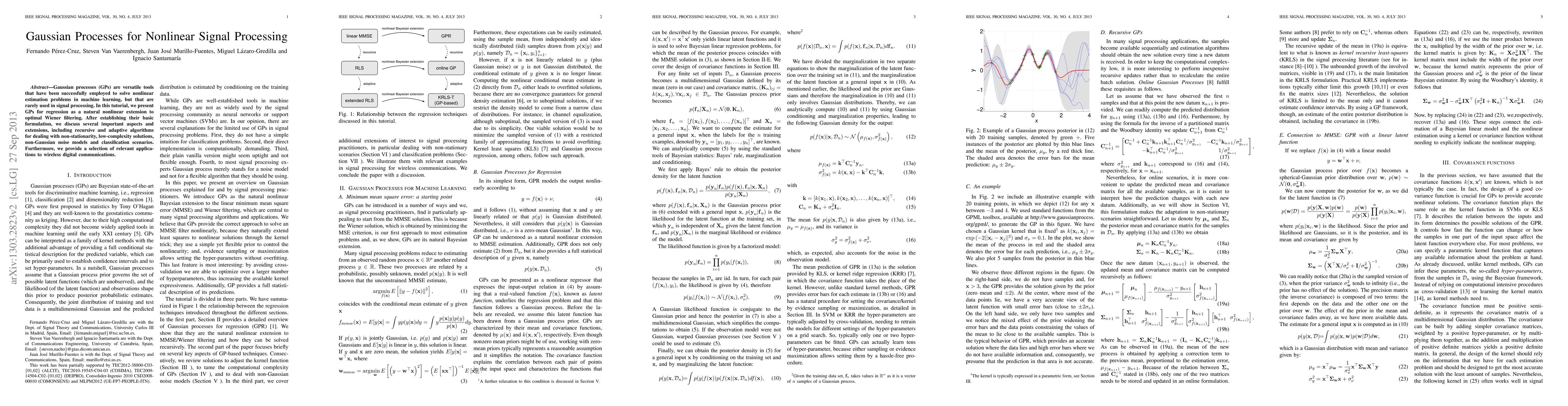 This paper introduces Gaussian processes (GPs) as a nonlinear extension to optimal Wiener filtering for signal processing, discussing recursive and adaptive algorithms, low-complexity solutions, and applications to wireless digital communications. It also covers non-Gaussian noise models and classification scenarios.