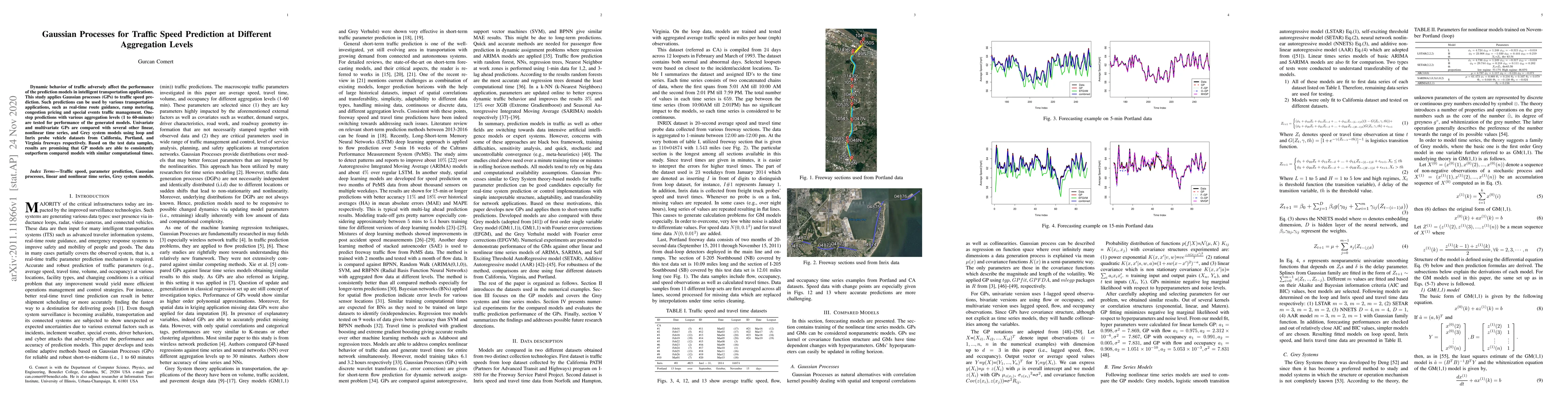 This study applies Gaussian processes to predict traffic speeds at different aggregation levels, demonstrating their effectiveness over linear, nonlinear, and Grey system models. Results from California, Portland, and Virginia datasets show that Gaussian processes outperform other models consistently, making them suitable for applications like real-time route guidance and congestion management.