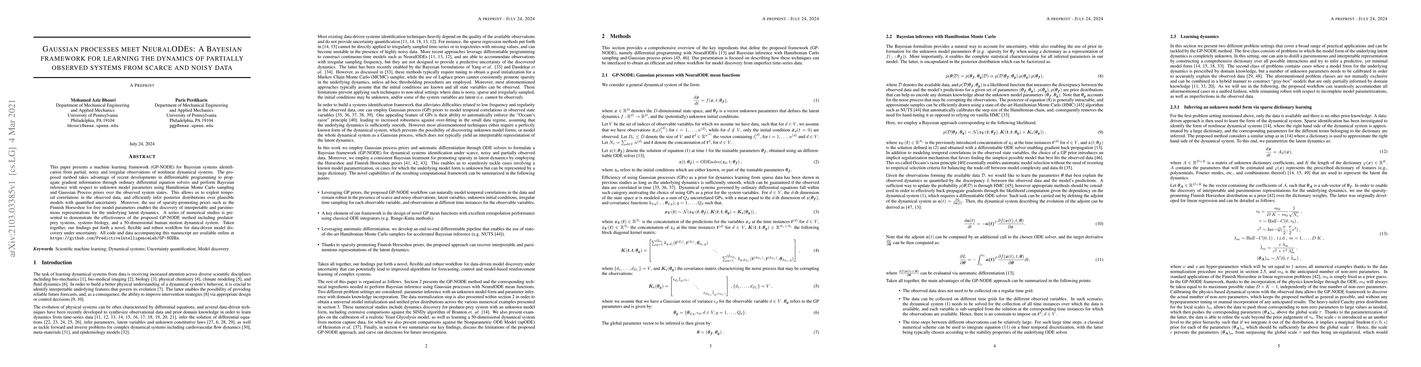 This paper presents a machine learning framework (GP-NODE) for Bayesian systems identification from partial, noisy and irregular observations of nonlinear dynamical systems. The proposed method takes advantage of recent developments in differentiable programming to propagate gradient information through ordinary differential equation solvers and perform Bayesian inference with respect to unknown model parameters using Hamiltonian Monte Carlo sampling and Gaussian Process priors over the observed system states. This allows us to exploit temporal correlations in the observed data, and efficiently infer posterior distributions over plausible models with quantified uncertainty. Moreover, the use of sparsity-promoting priors such as the Finnish Horseshoe for free model parameters enables the discovery of interpretable and parsimonious representations for the underlying latent dynamics. A series of numerical studies is presented to demonstrate the effectiveness of the proposed GP-NODE method including predator-prey systems, systems biology, and a 50-dimensional human motion dynamical system. Taken together, our findings put forth a novel, flexible and robust workflow for data-driven model discovery under uncertainty. All code and data accompanying this manuscript are available online at \url{https://github.com/PredictiveIntelligenceLab/GP-NODEs}.