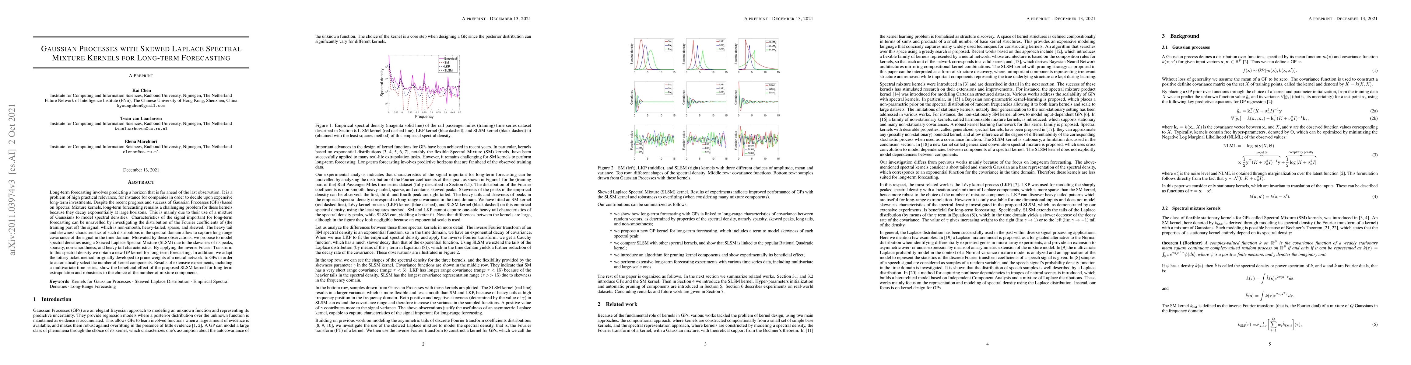 This paper proposes a skewed Laplace spectral mixture (SLSM) kernel for Gaussian processes to enhance long-term forecasting by capturing the signal's non-smooth, heavy-tailed, sparse, and skewed characteristics. It also adapts the lottery ticket method to automatically select the number of kernel components, demonstrating improved performance in long-term extrapolation and robustness.