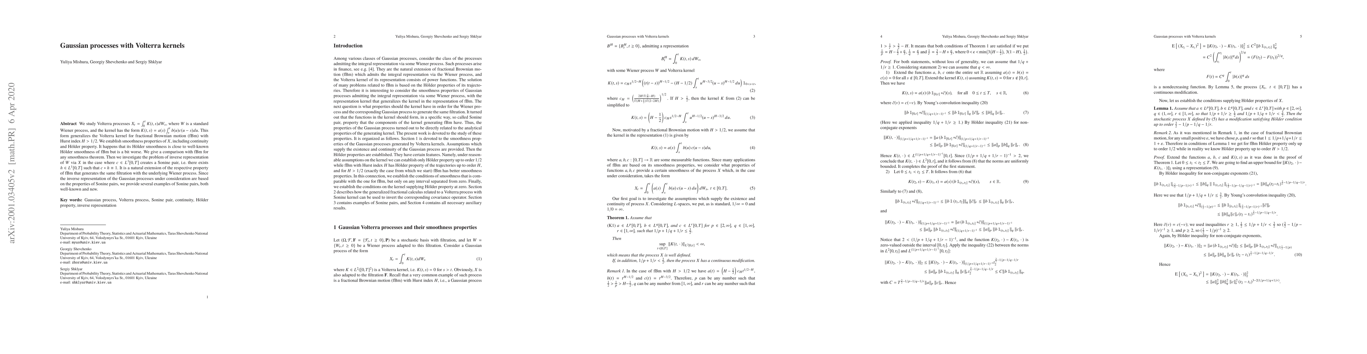 We study Volterra processes $X_t = \int_0^t K(t,s) dW_s$, where $W$ is a standard Wiener process, and the kernel has the form $K(t,s) = a(s) \int_s^t b(u) c(u-s) du$. This form generalizes the Volterra kernel for fractional Brownian motion (fBm) with Hurst index $H>1/2$. We establish smoothness properties of $X$, including continuity and Holder property. It happens that its Holder smoothness is close to well-known Holder smoothness of fBm but is a bit worse. We give a comparison with fBm for any smoothness theorem. Then we investigate the problem of inverse representation of $W$ via $X$ in the case where $c\in L^1[0,T]$ creates a Sonine pair, i.e. there exists $h\in L^1[0,T]$ such that $c * h = 1$. It is a natural extension of the respective property of fBm that generates the same filtration with the underlying Wiener process. Since the inverse representation of the Gaussian processes under consideration are based on the properties of Sonine pairs, we provide several examples of Sonine pairs, both well-known and new. Key words: Gaussian process, Volterra process, Sonine pair, continuity, Holder property, inverse representation.