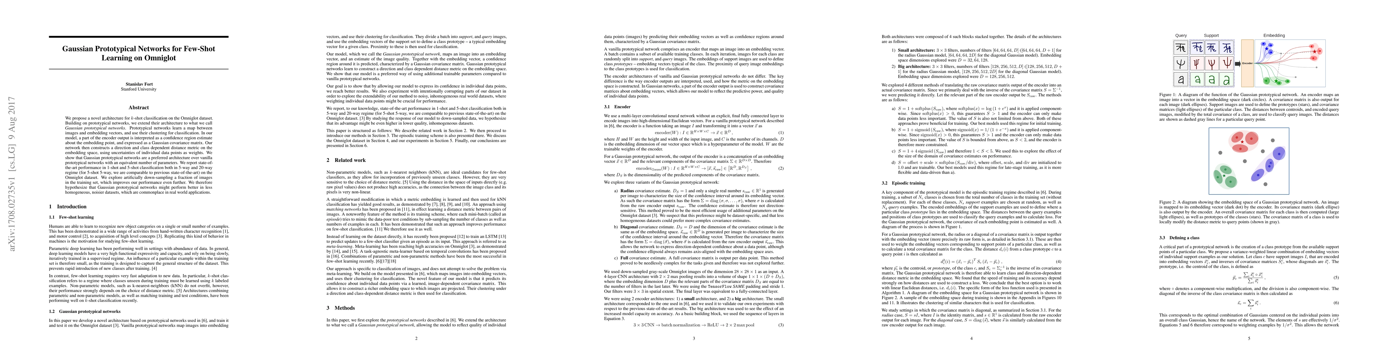 This paper introduces Gaussian prototypical networks for few-shot learning on the Omniglot dataset, enhancing prototypical networks by incorporating Gaussian covariance matrices to model confidence regions. The proposed model achieves state-of-the-art performance in 1-shot and 5-shot classification, suggesting better performance in noisier real-world datasets.