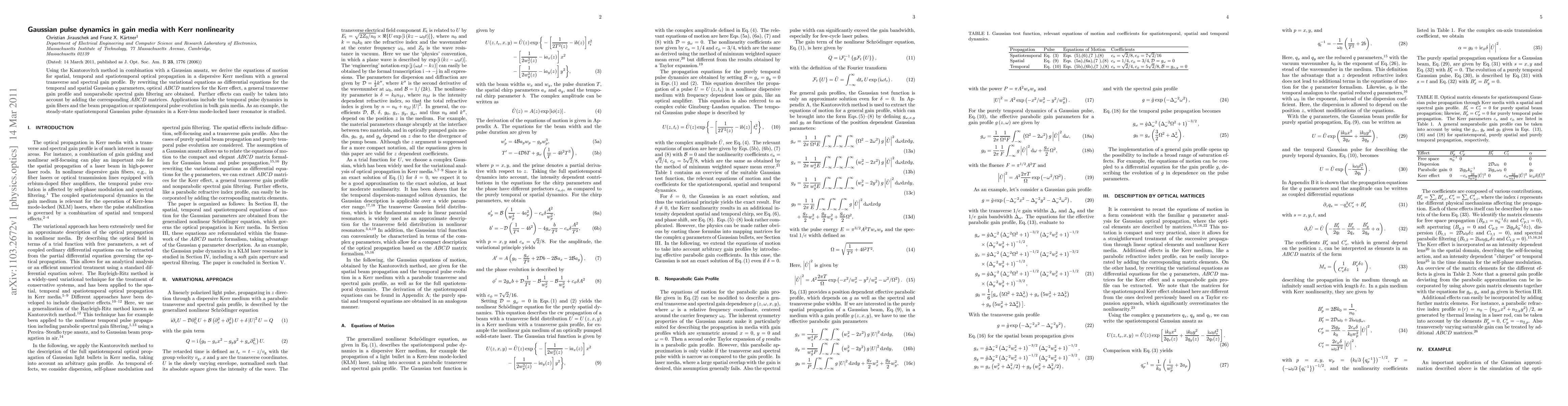 This paper uses the Kantorovitch method and Gaussian ansatz to derive equations for optical pulse dynamics in gain media with Kerr nonlinearity, incorporating both transverse and spectral gain profiles. The study applies these equations to analyze spatiotemporal pulse evolution in gain fibers and bulk gain media, exemplified by a Kerr-lens mode-locked laser.