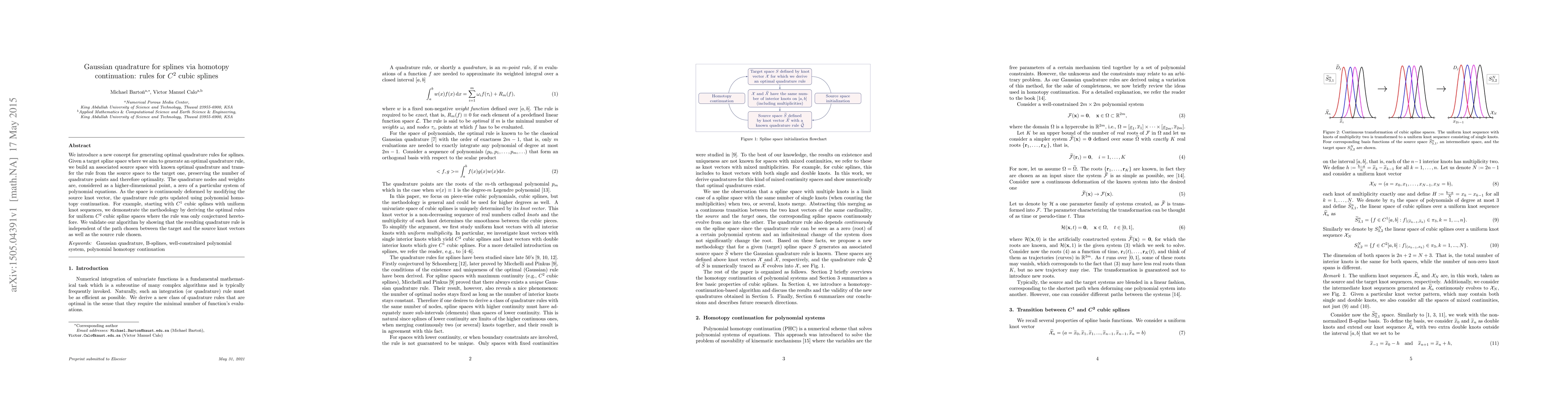 We introduce a new concept for generating optimal quadrature rules for splines. Given a target spline space where we aim to generate an optimal quadrature rule, we build an associated source space with known optimal quadrature and transfer the rule from the source space to the target one, preserving the number of quadrature points and therefore optimality. The quadrature nodes and weights are, considered as a higher-dimensional point, a zero of a particular system of polynomial equations. As the space is continuously deformed by modifying the source knot vector, the quadrature rule gets updated using polynomial homotopy continuation. For example, starting with $C^1$ cubic splines with uniform knot sequences, we demonstrate the methodology by deriving the optimal rules for uniform $C^2$ cubic spline spaces where the rule was only conjectured heretofore. We validate our algorithm by showing that the resulting quadrature rule is independent of the path chosen between the target and the source knot vectors as well as the source rule chosen.