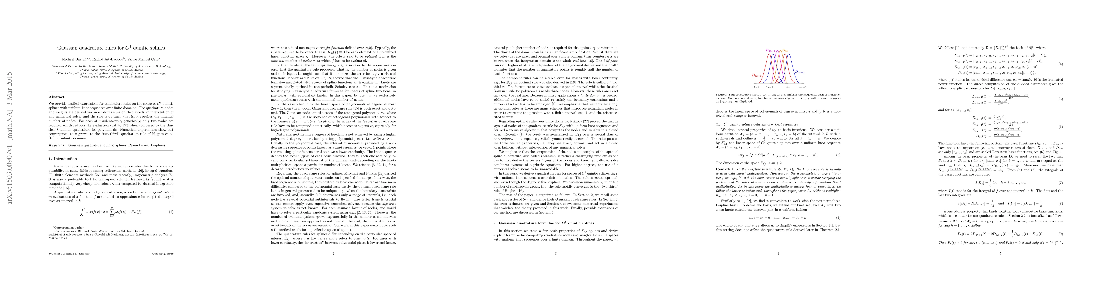 This paper presents explicit expressions for optimal Gaussian quadrature rules for $C^1$ quintic splines, requiring only two nodes per subinterval, thus reducing evaluation costs by two-thirds compared to classical Gaussian quadrature for polynomials. Numerical experiments confirm the fast convergence of these rules.