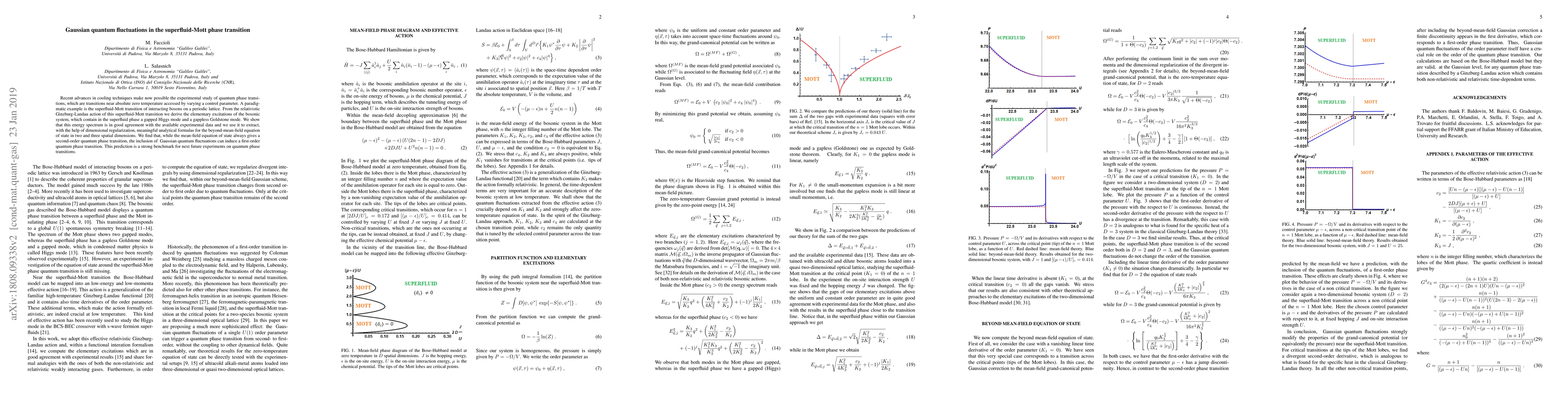 Recent advances in cooling techniques make now possible the experimental study of quantum phase transitions, which are transitions near absolute zero temperature accessed by varying a control parameter. A paradigmatic example is the superfluid-Mott transition of interacting bosons on a periodic lattice. From the relativistic Ginzburg-Landau action of this superfluid-Mott transition we derive the elementary excitations of the bosonic system, which contain in the superfluid phase a gapped Higgs mode and a gappless Goldstone mode. We show that this energy spectrum is in good agreement with the available experimental data and we use it to extract, with the help of dimensional regularization, meaningful analytical formulas for the beyond-mean-field equation of state in two and three spatial dimensions. We find that, while the mean-field equation of state always gives a second-order quantum phase transition, the inclusion of Gaussian quantum fluctuations can induce a first-order quantum phase transition. This prediction is a strong benchmark for next future experiments on quantum phase transitions.
