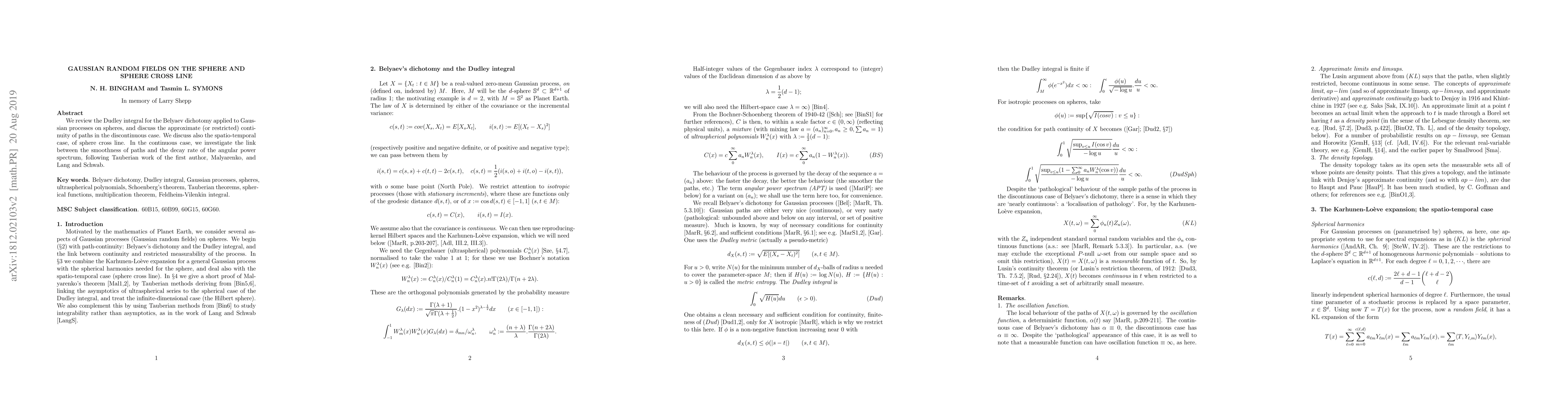 We review the Dudley integral for the Belyaev dichotomy applied to Gaussian processes on spheres, and discuss the approximate (or restricted) continuity of paths in the discontinuous case. We discuss also the spatio-temporal case, of sphere cross line. In the continuous case, we investigate the link between the smoothness of paths and the decay rate of the angular power spectrum, following Tauberian work of the first author, Malyarenko, and Lang and Schwab.