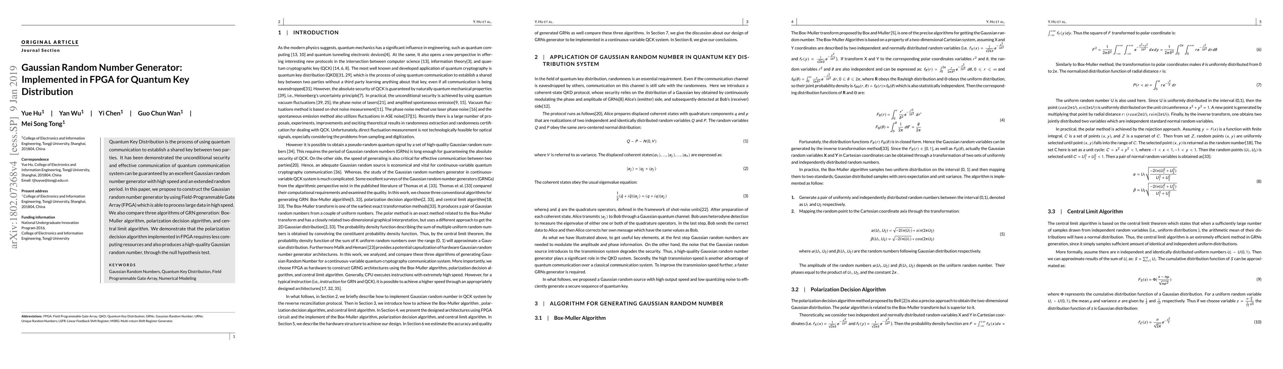 This paper proposes an FPGA-based Gaussian random number generator for quantum key distribution, comparing three algorithms: Box-Muller, polarization decision, and central limit. The polarization decision algorithm, implemented in FPGA, is shown to require fewer resources while producing high-quality Gaussian random numbers, validated through a null hypothesis test.