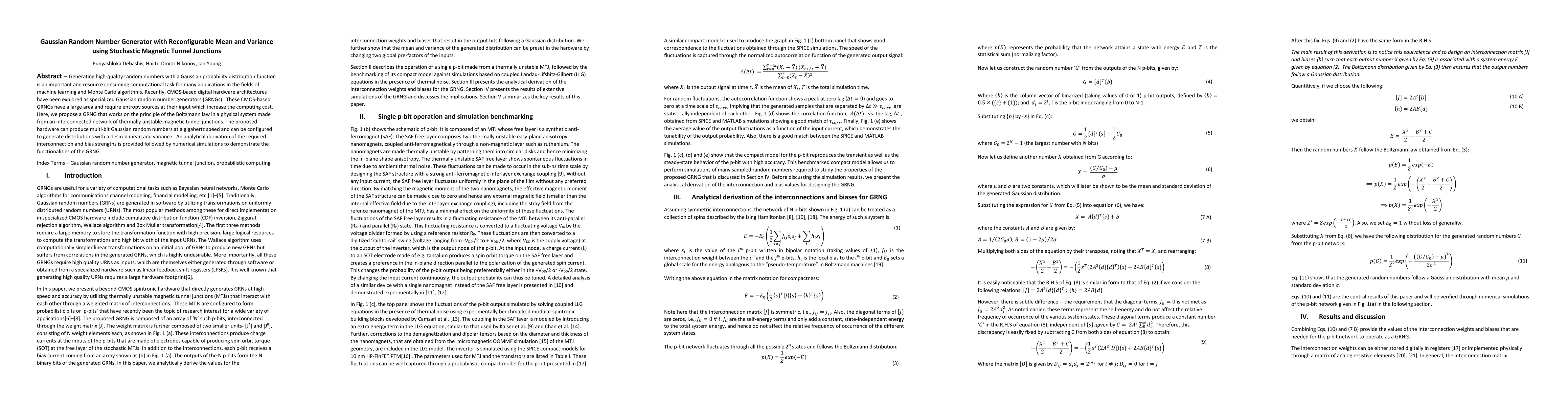 This paper proposes a novel Gaussian random number generator (GRNG) based on an interconnected network of stochastic magnetic tunnel junctions, which operates on the Boltzmann law. This hardware can generate high-quality Gaussian random numbers at gigahertz speeds with reconfigurable mean and variance, offering a cost-effective alternative to CMOS-based GRNGs.