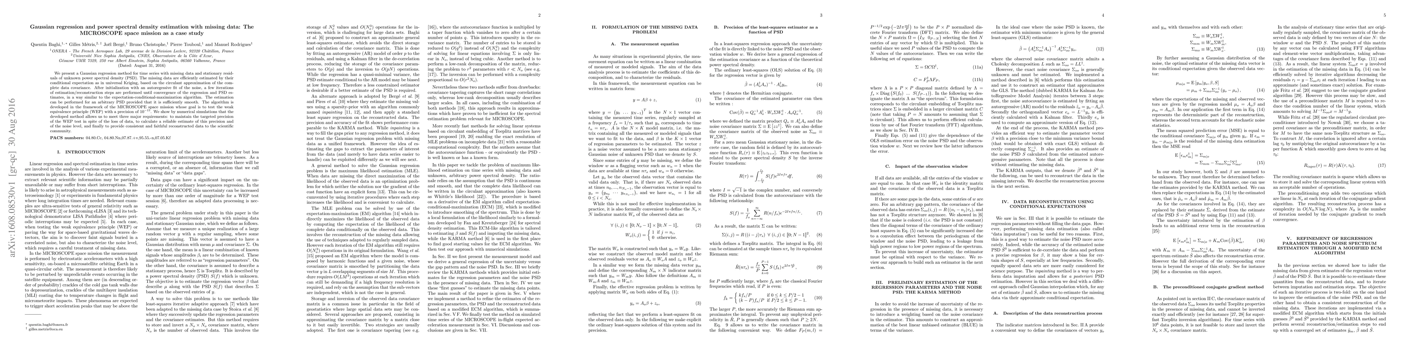 This paper introduces a Gaussian regression method for time series data with missing values, employing circulant approximation for covariance estimation and iterative estimation/reconstruction to achieve convergence. The method is applied to the MICROSCOPE space mission to test the weak equivalence principle, demonstrating its ability to maintain precision despite data loss.