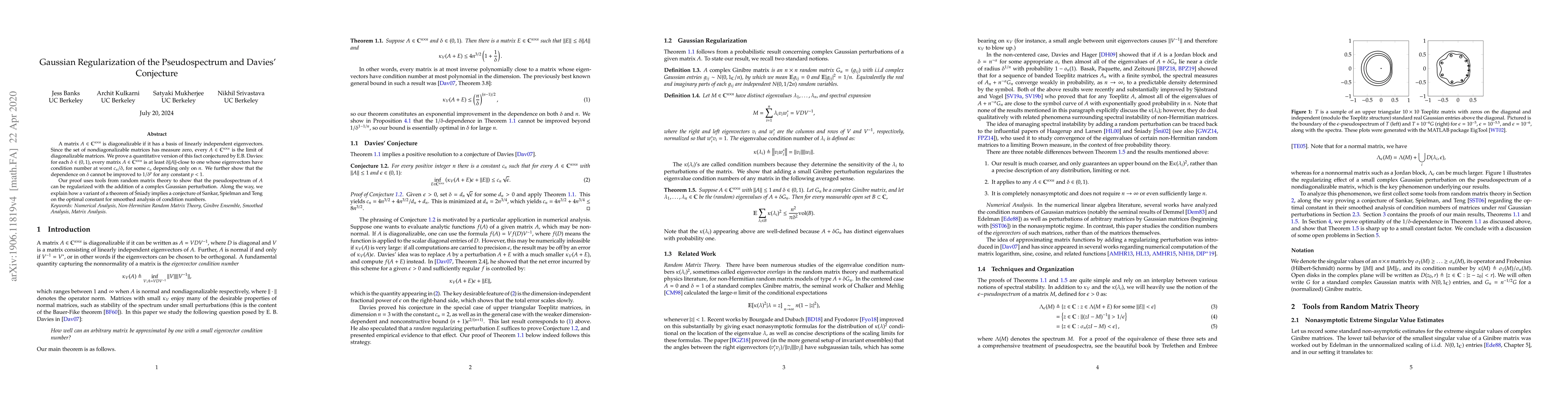 A matrix $A\in\mathbb{C}^{n\times n}$ is diagonalizable if it has a basis of linearly independent eigenvectors. Since the set of nondiagonalizable matrices has measure zero, every $A\in \mathbb{C}^{n\times n}$ is the limit of diagonalizable matrices. We prove a quantitative version of this fact conjectured by E.B. Davies: for each $\delta\in (0,1)$, every matrix $A\in \mathbb{C}^{n\times n}$ is at least $\delta\|A\|$-close to one whose eigenvectors have condition number at worst $c_n/\delta$, for some constants $c_n$ dependent only on $n$. Our proof uses tools from random matrix theory to show that the pseudospectrum of $A$ can be regularized with the addition of a complex Gaussian perturbation. Along the way, we explain how a variant of a theorem of \'Sniady implies a conjecture of Sankar, Spielman and Teng on the optimal constant for smoothed analysis of condition numbers.