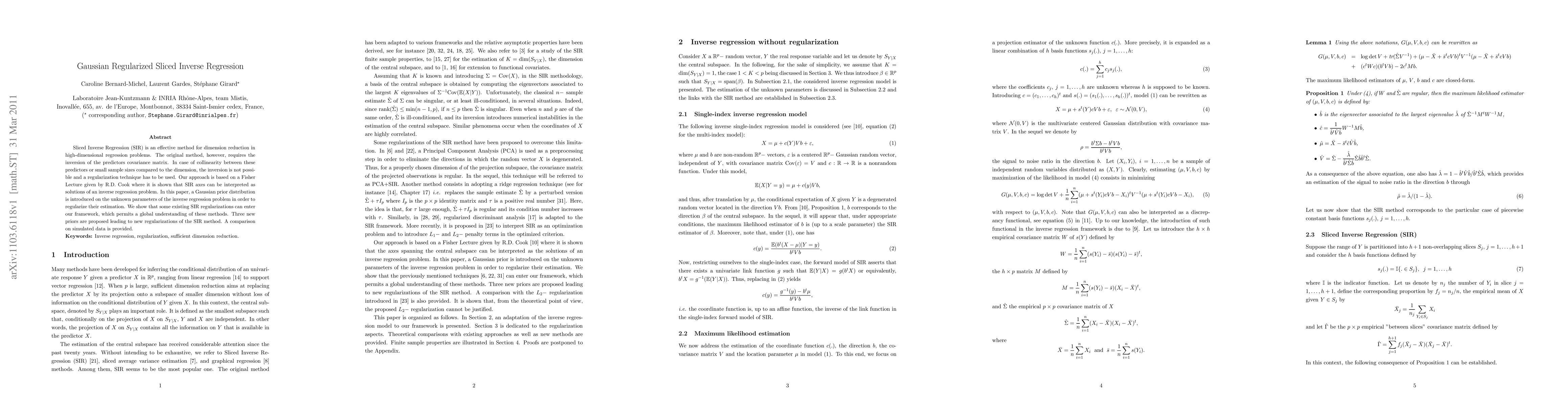 This paper proposes a Gaussian regularized version of Sliced Inverse Regression (SIR) to address issues of collinearity and small sample sizes. It introduces a Gaussian prior on the inverse regression parameters to regularize their estimation, providing a unified framework for existing SIR regularizations and proposing three new regularization methods, which are compared using simulated data.