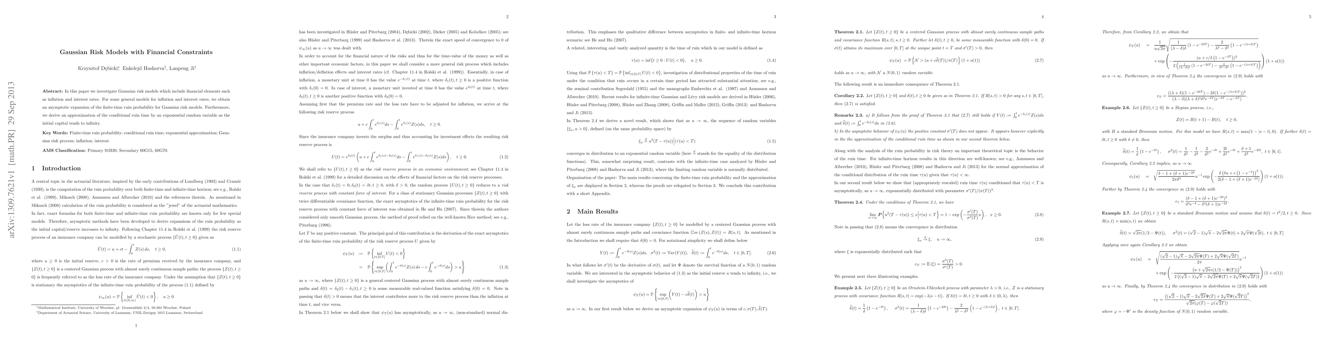 This paper examines Gaussian risk models incorporating financial factors like inflation and interest rates, providing an asymptotic expansion for the finite-time ruin probability and an approximation of the conditional ruin time as initial capital increases.