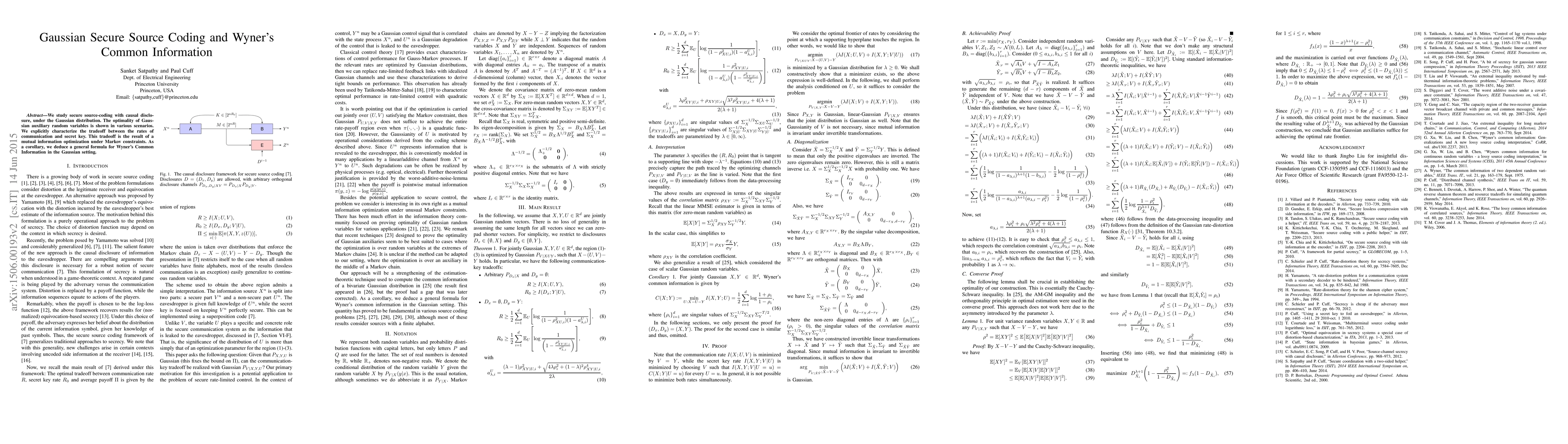 This paper explores secure source coding under Gaussian distributions, demonstrating the optimality of Gaussian auxiliary variables. It characterizes the tradeoff between communication and secret key rates, revealing a mutual information optimization under Markov constraints, and derives a formula for Wyner's Common Information in Gaussian settings.