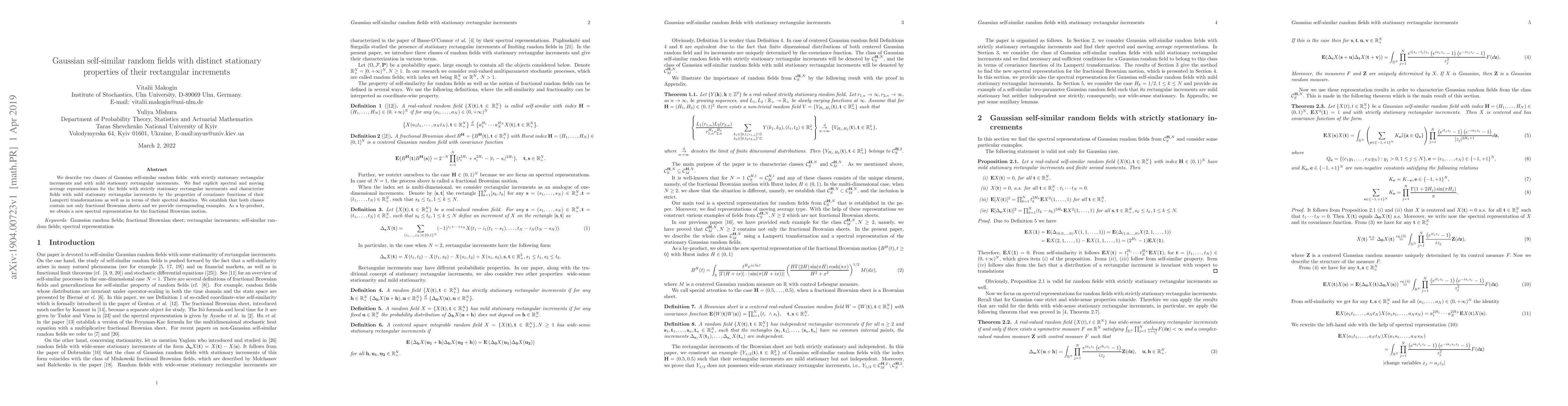 This paper categorizes Gaussian self-similar random fields into two classes based on stationary properties of their rectangular increments: strictly stationary and mildly stationary. It provides explicit representations for the strictly stationary class and characterizes the mildly stationary class through covariance functions and spectral densities.