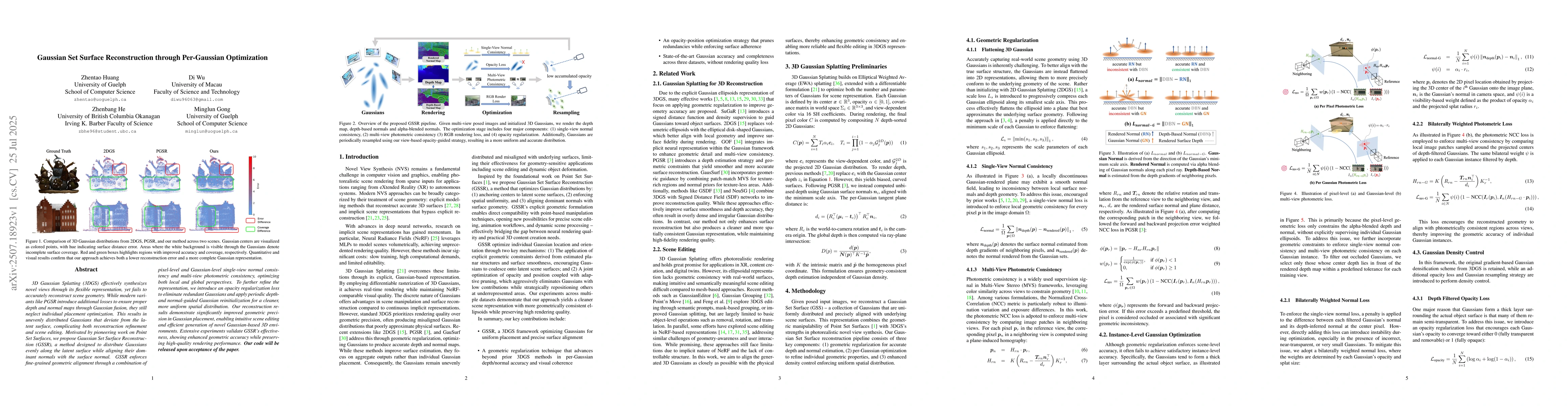 3D Gaussian Splatting (3DGS) effectively synthesizes novel views through its flexible representation, yet fails to accurately reconstruct scene geometry. While modern variants like PGSR introduce additional losses to ensure proper depth and normal maps through Gaussian fusion, they still neglect individual placement optimization. This results in unevenly distributed Gaussians that deviate from the latent surface, complicating both reconstruction refinement and scene editing. Motivated by pioneering work on Point Set Surfaces, we propose Gaussian Set Surface Reconstruction (GSSR), a method designed to distribute Gaussians evenly along the latent surface while aligning their dominant normals with the surface normal. GSSR enforces fine-grained geometric alignment through a combination of pixel-level and Gaussian-level single-view normal consistency and multi-view photometric consistency, optimizing both local and global perspectives. To further refine the representation, we introduce an opacity regularization loss to eliminate redundant Gaussians and apply periodic depth- and normal-guided Gaussian reinitialization for a cleaner, more uniform spatial distribution. Our reconstruction results demonstrate significantly improved geometric precision in Gaussian placement, enabling intuitive scene editing and efficient generation of novel Gaussian-based 3D environments. Extensive experiments validate GSSR's effectiveness, showing enhanced geometric accuracy while preserving high-quality rendering performance.