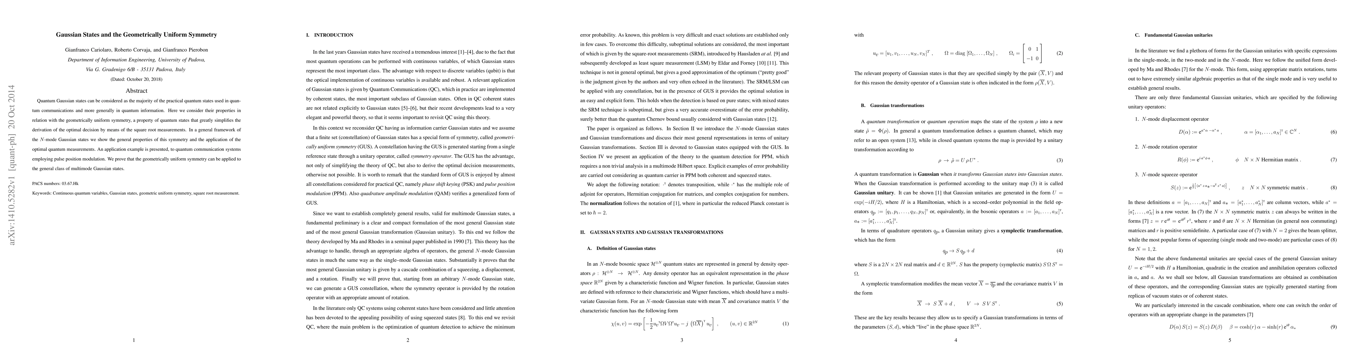 Quantum Gaussian states can be considered as the majority of the practical quantum states used in quantum communications and more generally in quantum information. Here we consider their properties in relation with the geometrically uniform symmetry, a property of quantum states that greatly simplifies the derivation of the optimal decision by means of the square root measurements. In a general framework of the $N$-mode Gaussian states we show the general properties of this symmetry and the application of the optimal quantum measurements. An application example is presented, to quantum communication systems employing pulse position modulation. We prove that the geometrically uniform symmetry can be applied to the general class of multimode Gaussian states.