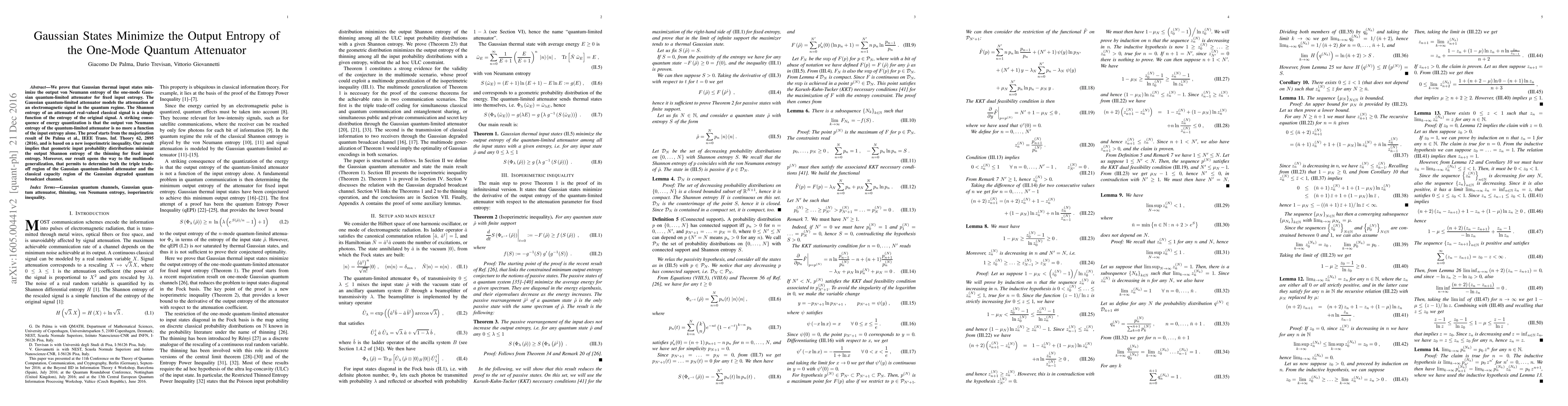 This paper demonstrates that Gaussian thermal input states minimize the output entropy of a one-mode quantum attenuator for a fixed input entropy, leveraging a majorization result and a new isoperimetric inequality. The findings suggest that geometric input distributions minimize the output Shannon entropy of signal attenuation under fixed entropy constraints.