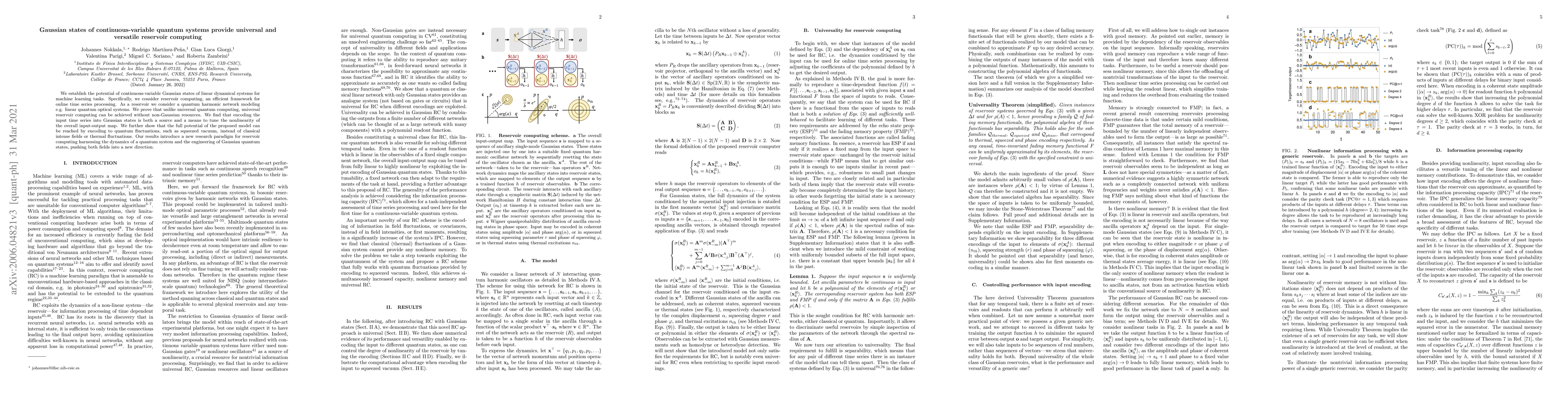This paper demonstrates that continuous-variable Gaussian states in quantum systems can universally enable reservoir computing for efficient time series processing, without requiring non-Gaussian resources. It highlights the potential of encoding input data into Gaussian states to optimize the nonlinearity of the system, and suggests that quantum fluctuations like squeezed vacuum states offer superior performance over classical methods.