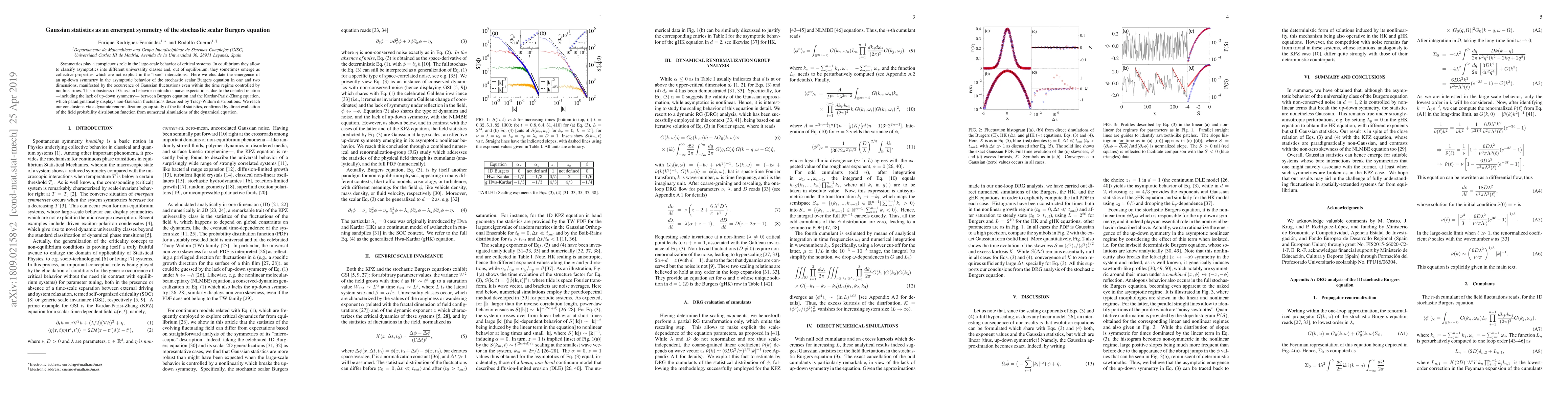 Symmetries play a conspicuous role in the large-scale behavior of critical systems. While in equilibrium they allow to classify asymptotics into different universality classes, out of equilibrium they can emerge, some times unexpectedly, as collective properties which are not explicit in the 'bare' interactions. Here we elucidate the emergence of an up-down symmetry in the asymptotic behavior of the stochastic scalar Burgers equation in one and two dimensions, manifested by the occurrence of Gaussian fluctuations for the physical field. This robustness of Gaussian behavior contradicts naive expectations, due to the detailed relation ---including the same set of symmetries--- between Burgers equation and the Kardar-Parisi-Zhang equation, which paradigmatically displays non-Gaussian fluctuations described by Tracy-Widom distributions. We reach our conclusions via a dynamic renormalization group study of the field statistics, confirmed by direct evaluation of the field probability distribution function from numerical simulations of the dynamical equation. All odd-order cumulants cancel exactly, while the excess kurtosis vanishes for large systems, indeed consistent with Gaussian behavior.