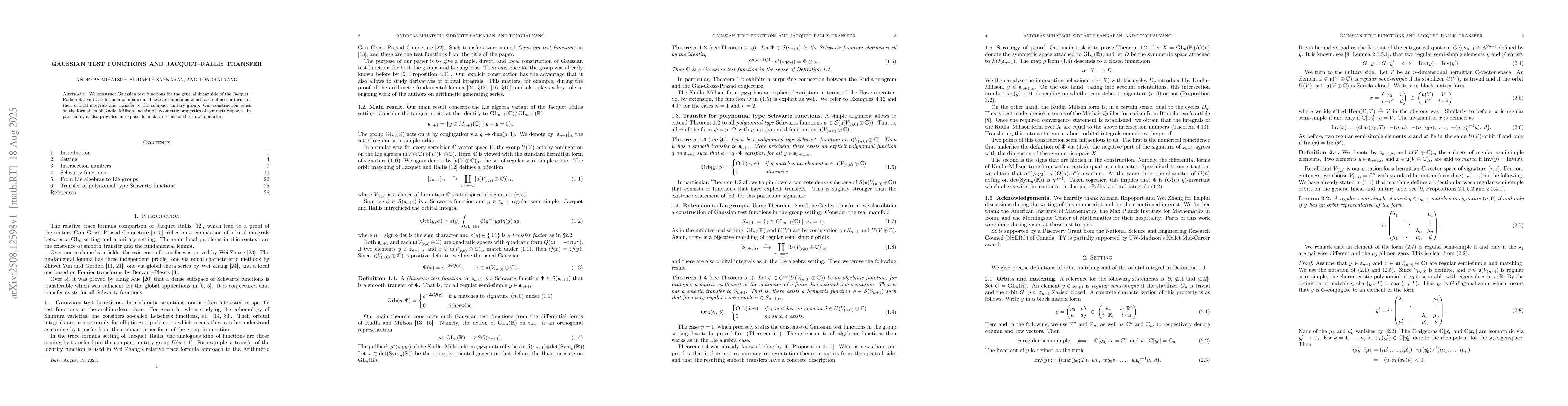 We construct Gaussian test functions for the general linear side of the Jacquet-Rallis relative trace formula comparison. These are functions which are defined in terms of their orbital integrals and transfer to the compact unitary group. Our construction relies on the formalism of Kudla-Millson and simple geometric properties of symmetric spaces. In particular, it also provides an explicit formula in terms of the Howe operator.