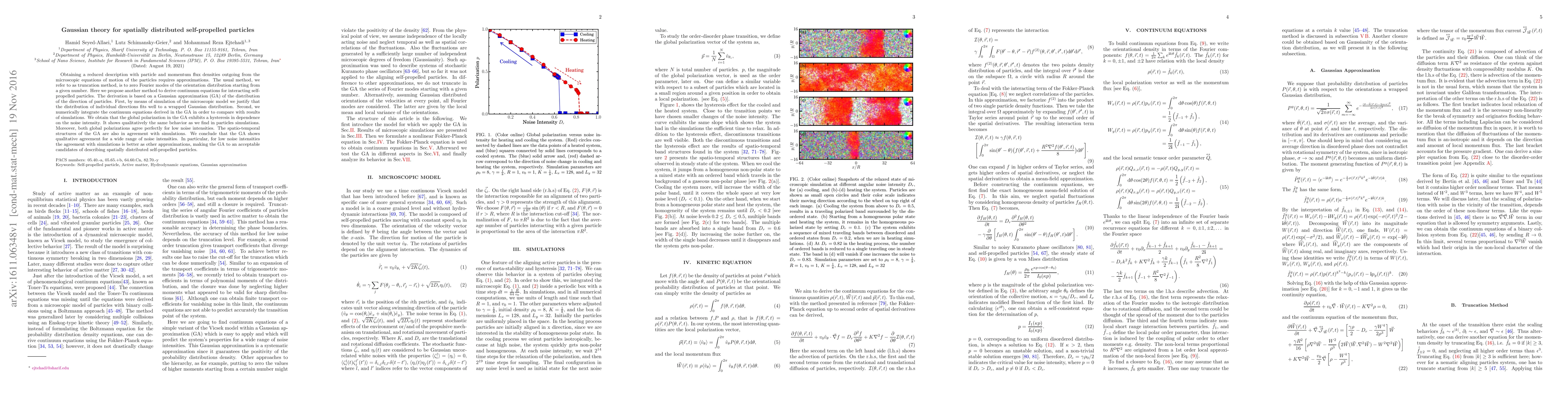 Obtaining a reduced description with particle and momentum flux densities outgoing from the microscopic equations of motion of the particles requires approximations. The usual method, we refer to as truncation method, is to zero Fourier modes of the orientation distribution starting from a given number. Here we propose another method to derive continuum equations for interacting self-propelled particles. The derivation is based on a Gaussian approximation (GA) of the distribution of the direction of particles. First, by means of simulation of the microscopic model we justify that the distribution of individual directions fits well to a wrapped Gaussian distribution. Second, we numerically integrate the continuum equations derived in the GA in order to compare with results of simulations. We obtain that the global polarization in the GA exhibits a hysteresis in dependence on the noise intensity. It shows qualitatively the same behavior as we find in particles simulations. Moreover, both global polarizations agree perfectly for low noise intensities. The spatio-temporal structures of the GA are also in agreement with simulations. We conclude that the GA shows qualitative agreement for a wide range of noise intensities. In particular, for low noise intensities the agreement with simulations is better as other approximations, making the GA to an acceptable candidates of describing spatially distributed self-propelled particles.