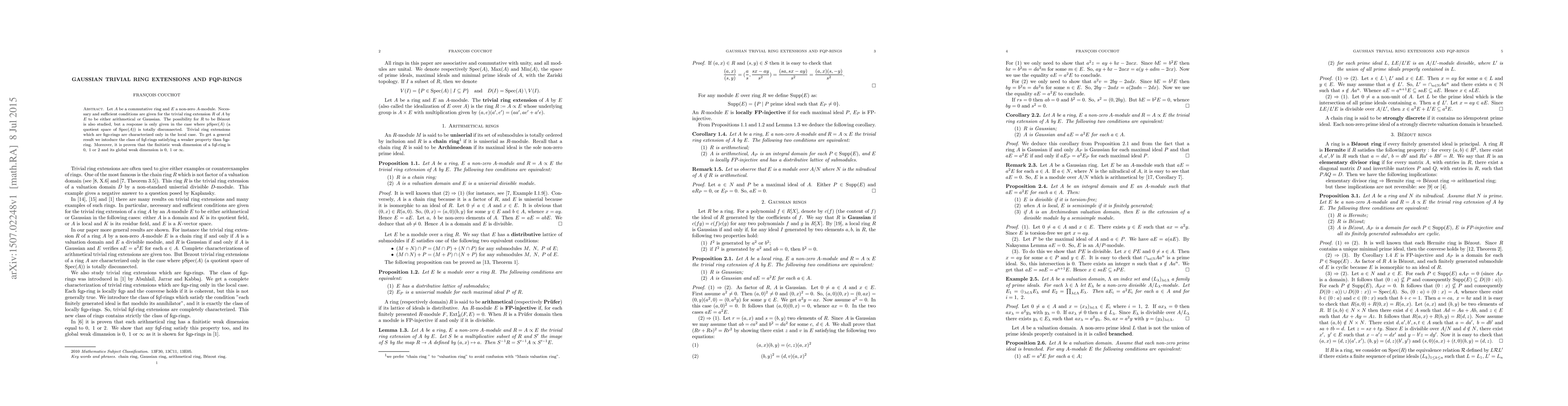 This paper explores conditions for trivial ring extensions to be arithmetical or Gaussian, and studies when such extensions can be Bézout rings. It characterizes fqp-rings in trivial extensions and introduces fqf-rings with specific weak dimension properties.