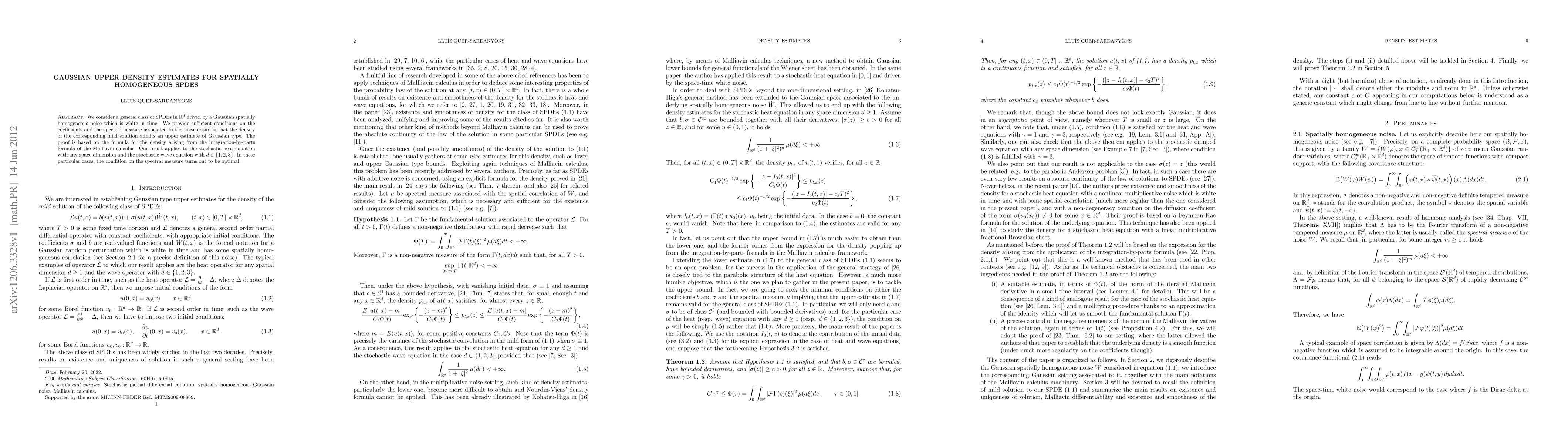 This paper establishes sufficient conditions for the mild solution of spatially homogeneous SPDEs driven by Gaussian noise to have Gaussian upper density estimates. The proof leverages the integration-by-parts formula from Malliavin calculus, and the results are optimal for the stochastic heat and wave equations in specified dimensions.