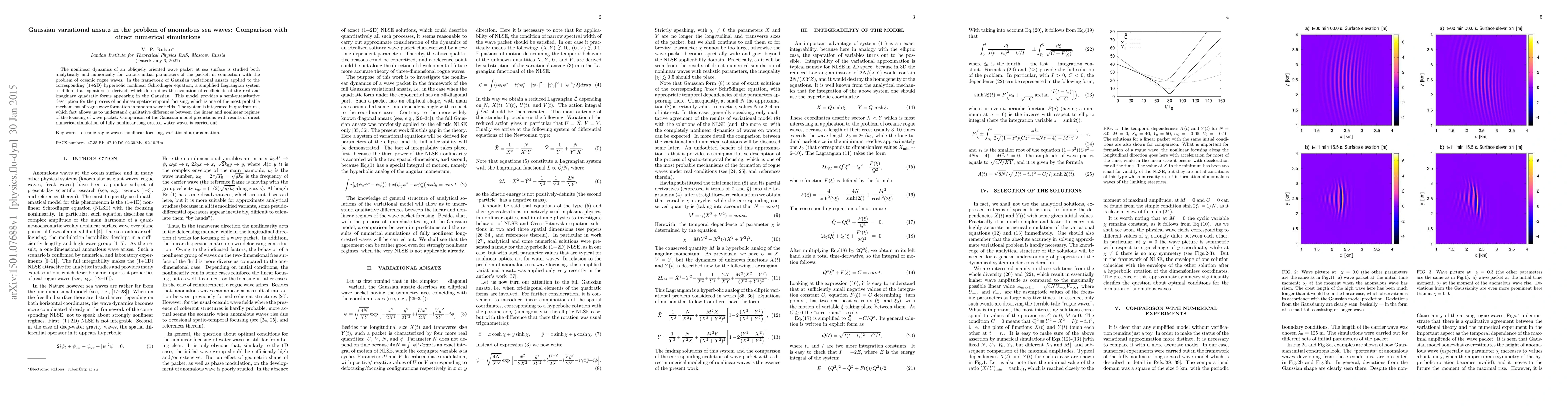 The nonlinear dynamics of an obliquely oriented wave packet at sea surface is studied both analytically and numerically for various initial parameters of the packet, in connection with the problem of oceanic rogue waves. In the framework of Gaussian variational ansatz applied to the corresponding (1+2D) hyperbolic nonlinear Schr\"odinger equation, a simplified Lagrangian system of differential equations is derived, which determines the evolution of coefficients of the real and imaginary quadratic forms appearing in the Gaussian. This model provides a semi-quantitative description for the process of nonlinear spatio-temporal focusing, which is one of the most probable mechanisms of rogue wave formation in random wave fields. The system is integrated in quadratures, which fact allows us to understand qualitative differences between the linear and nonlinear regimes of the focusing of wave packet. Comparison of the Gaussian model predictions with results of direct numerical simulation of fully nonlinear long-crested water waves is carried out.