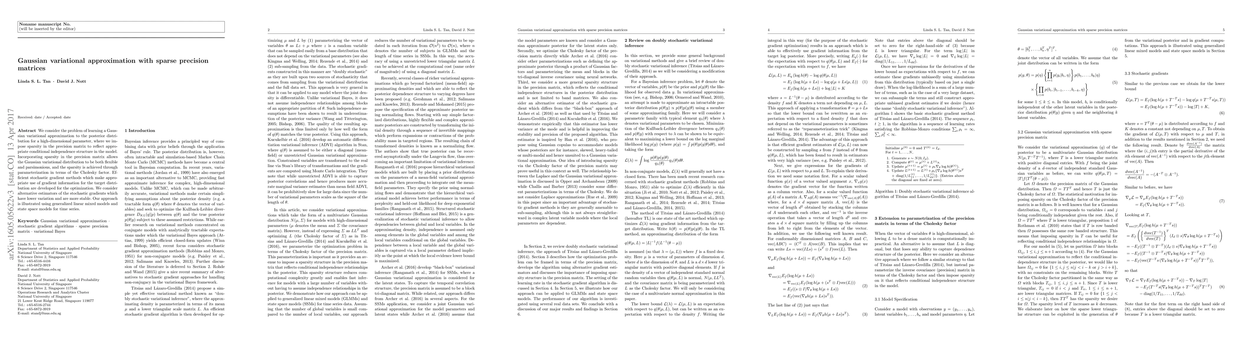 The paper proposes a Gaussian variational approximation with sparse precision matrices, achieved through parameterization in terms of the Cholesky factor. Stochastic gradient methods are developed for optimization, with improved estimators for stochastic gradients.