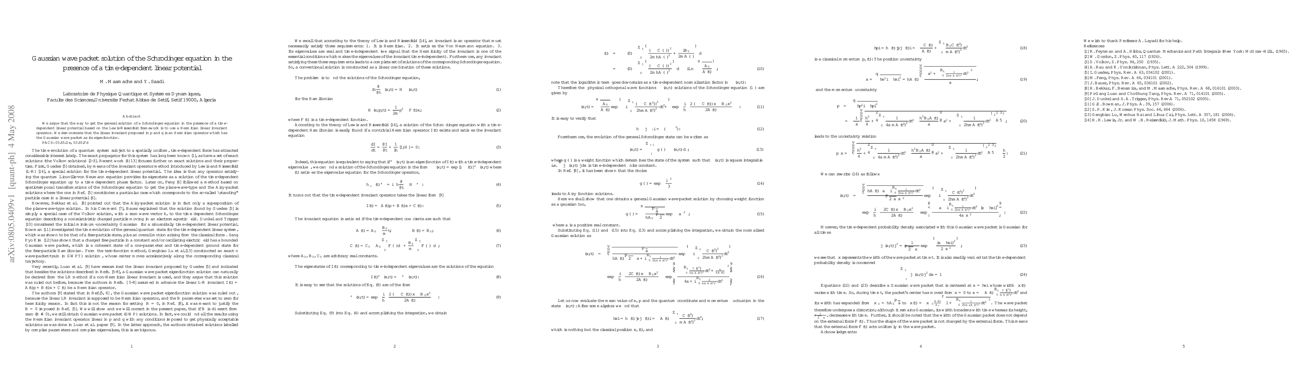 Researchers found a way to solve the Schrodinger equation with a time-dependent linear potential using a Hermitian linear invariant operator, which leads to a Gaussian wave packet solution.