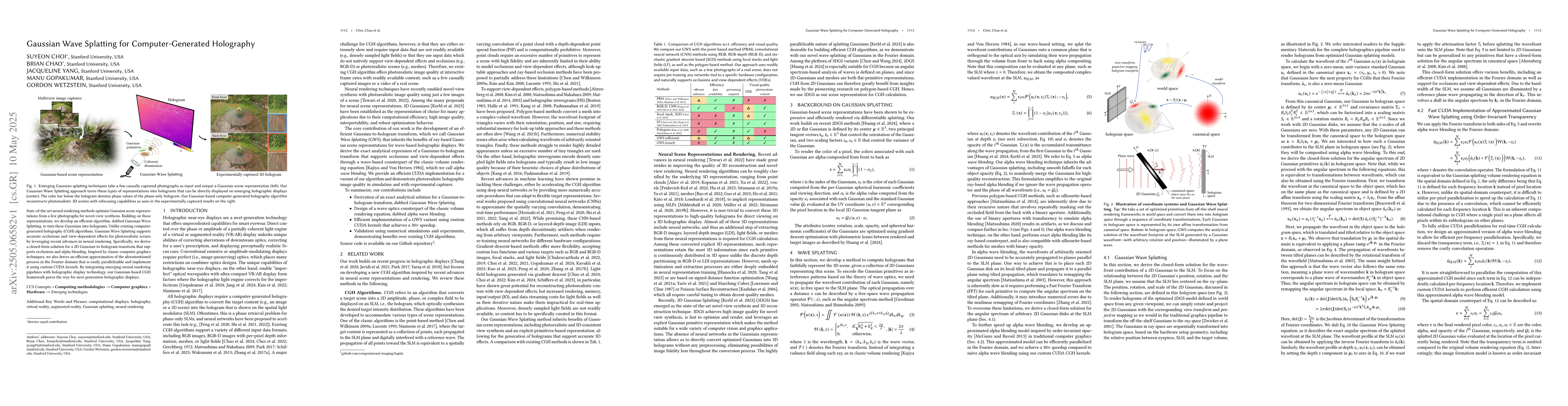 A new method called Gaussian Wave Splatting turns 2D Gaussian scene representations into holograms with accurate occlusions and view-dependent effects. This enables photorealistic scenes for next-generation holographic displays.