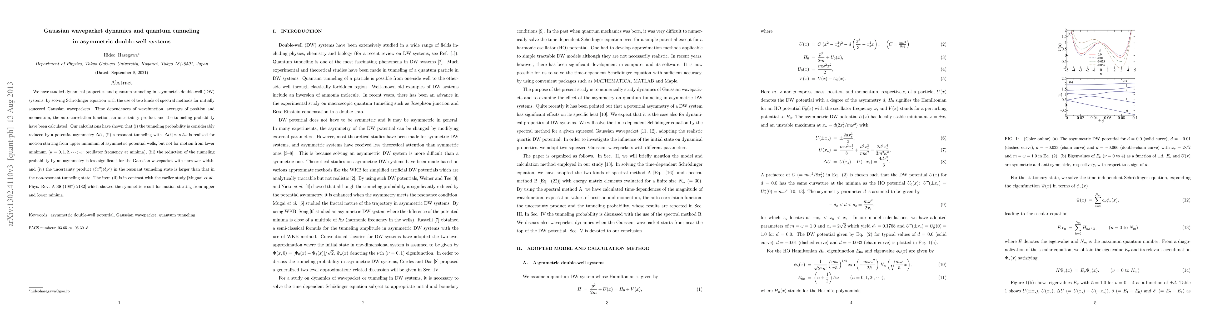 This paper investigates quantum tunneling and dynamics in asymmetric double-well systems using Gaussian wavepackets, revealing that tunneling probability is significantly reduced by potential asymmetry and that resonant tunneling occurs only from the upper minimum under specific conditions. The study also finds that narrower wavepackets experience less tunneling reduction.