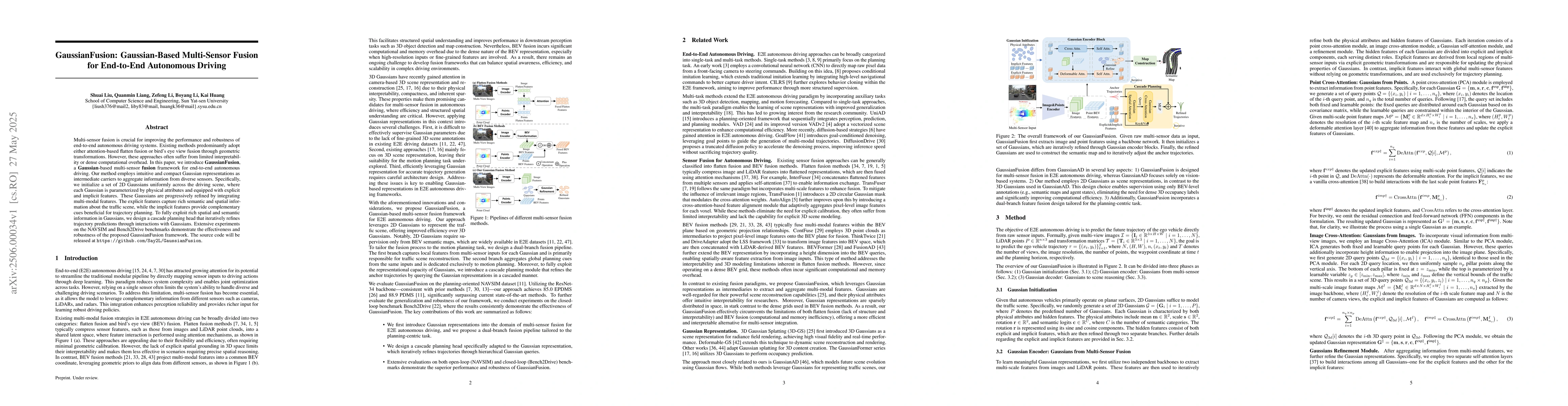GaussianFusion introduces a novel Gaussian-based multi-sensor fusion framework for end-to-end autonomous driving, offering improved interpretability and robustness through the use of compact Gaussian representations.