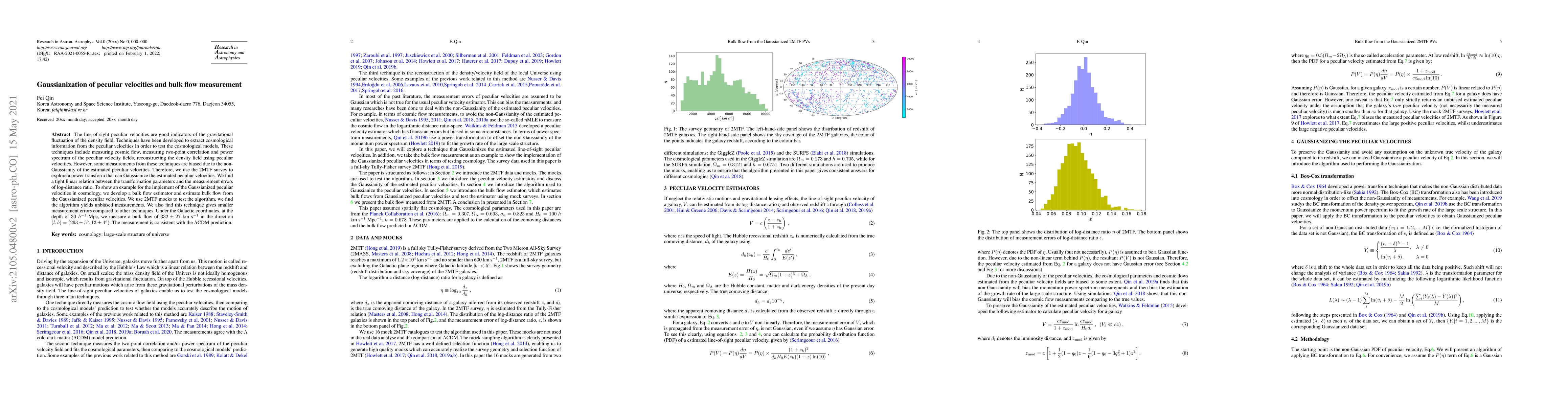 The line-of-sight peculiar velocities are good indicators of the gravitational fluctuation of the density field. Techniques have been developed to extract cosmological information from the peculiar velocities in order to test the cosmological models. These techniques include measuring cosmic flow, measuring two-point correlation and power spectrum of the peculiar velocity fields, reconstructing the density field using peculiar velocities. However, some measurements from these techniques are biased due to the non-Gaussianity of the estimated peculiar velocities. Therefore, we use the 2MTF survey to explore a power transform that can Gaussianize the estimated peculiar velocities. We find a tight linear relation between the transformation parameters and the measurement errors of log-distance ratio. To show an example for the implement of the Gaussianized peculiar velocities in cosmology, we develop a bulk flow estimator and estimate bulk flow from the Gaussianized peculiar velocities. We use 2MTF mocks to test the algorithm, we find the algorithm yields unbiased measurements. We also find this technique gives smaller measurement errors compared to other techniques. Under the Galactic coordinates, at the depth of $30$ $h^{-1}$ Mpc, we measure a bulk flow of $332\pm27$ km s$^{-1}$ in the direction $(l,b)=(293\pm 5^{\circ}, 13\pm 4^{\circ})$. The measurement is consistent with the $\Lambda$CDM prediction.