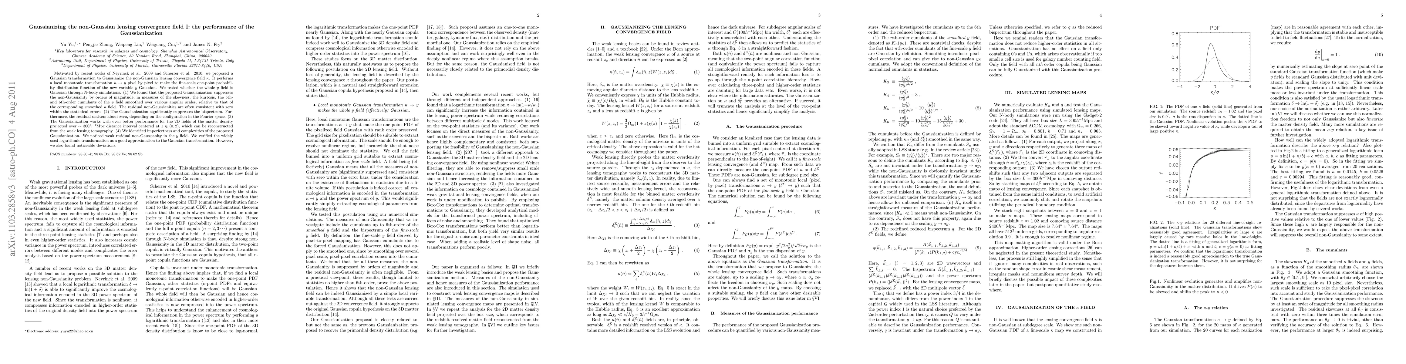 Motivated by recent works of Neyrinck et al. 2009 and Scherrer et al. 2010, we proposed a Gaussianization transform to Gaussianize the non-Gaussian lensing convergence field $\kappa$. It performs a local monotonic transformation $\kappa\rightarrow y$ pixel by pixel to make the unsmoothed one-point probability distribution function of the new variable $y$ Gaussian. We tested whether the whole $y$ field is Gaussian against N-body simulations. (1) We found that the proposed Gaussianization suppresses the non-Gaussianity by orders of magnitude, in measures of the skewness, the kurtosis, the 5th- and 6th-order cumulants of the $y$ field smoothed over various angular scales relative to that of the corresponding smoothed $\kappa$ field. The residual non-Gaussianities are often consistent with zero within the statistical errors. (2) The Gaussianization significantly suppresses the bispectrum. Furthermore, the residual scatters around zero, depending on the configuration in the Fourier space. (3) The Gaussianization works with even better performance for the 2D fields of the matter density projected over $\sim 300 \mpch$ distance interval centered at $z\in(0,2)$, which can be reconstructed from the weak lensing tomography. (4) We identified imperfectness and complexities of the proposed Gaussianization. We noticed weak residual non-Gaussianity in the $y$ field. We verified the widely used logarithmic transformation as a good approximation to the Gaussianization transformation. However, we also found noticeable deviations.