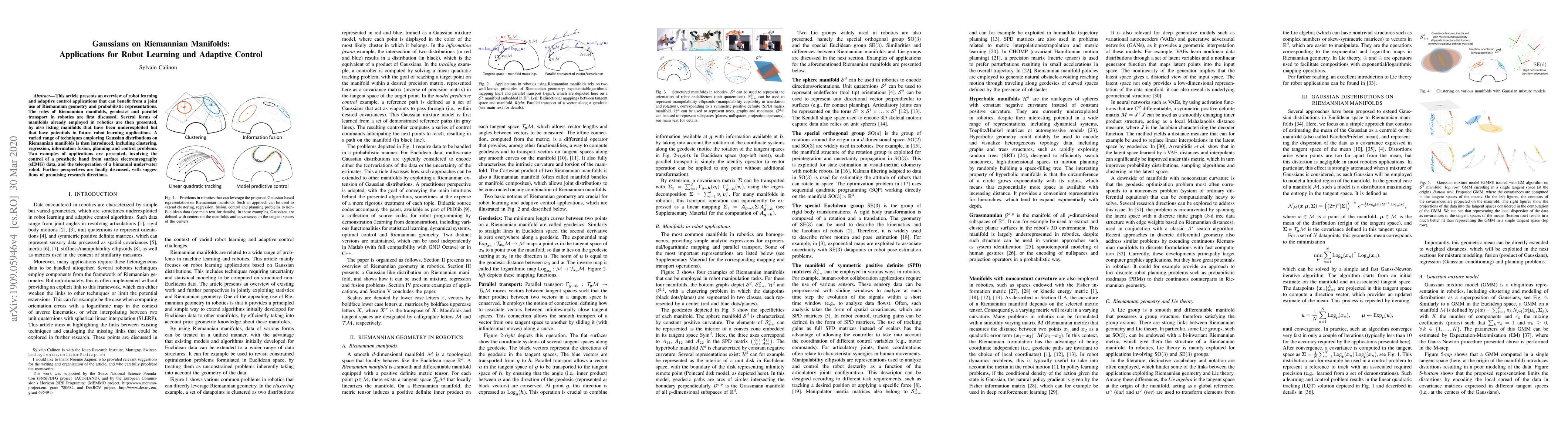 This paper explores the integration of Riemannian geometry and probabilistic methods for robot learning and adaptive control, highlighting the potential of underexploited manifolds and various Gaussian-based techniques for applications like prosthetic hand control and underwater robot teleoperation. Future research directions are also proposed.