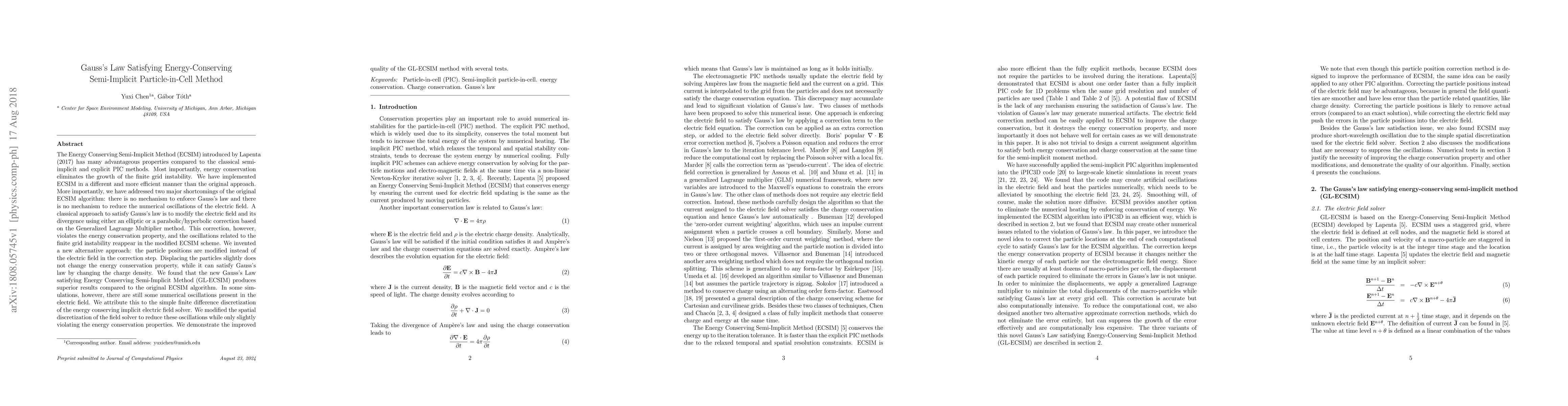 The paper introduces a new Gauss's Law satisfying Energy Conserving Semi-Implicit Method (GL-ECSIM) that modifies particle positions to satisfy Gauss's law without compromising energy conservation, addressing shortcomings of the original ECSIM. Further improvements to reduce electric field oscillations are made through modified spatial discretization.