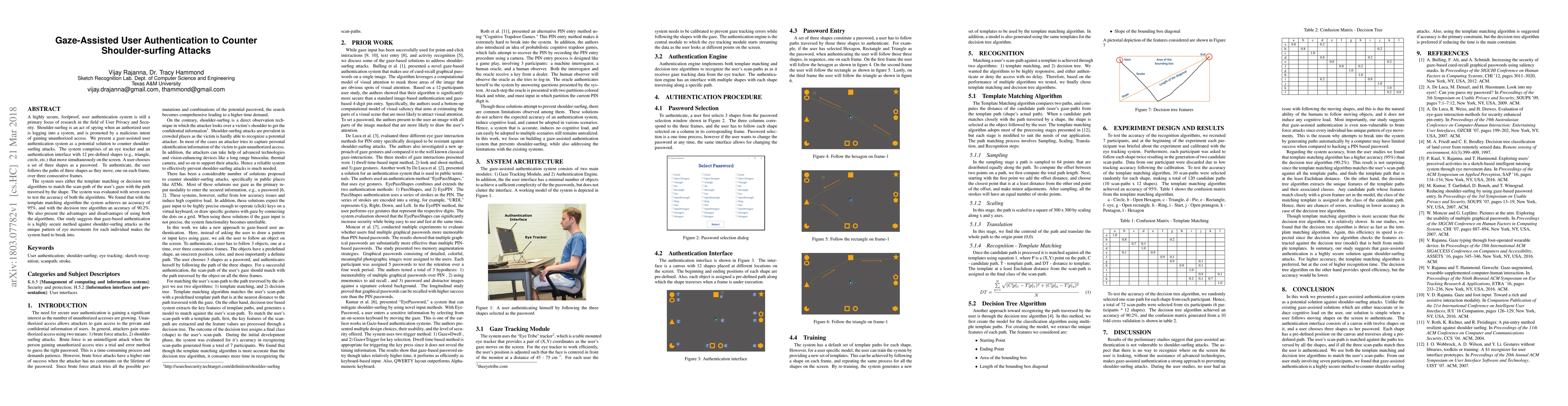 The paper introduces a gaze-assisted user authentication system that uses eye-tracking technology and pre-defined shapes moving on the screen, authenticated by matching the user's gaze path with the shape's path using template matching and decision tree algorithms.