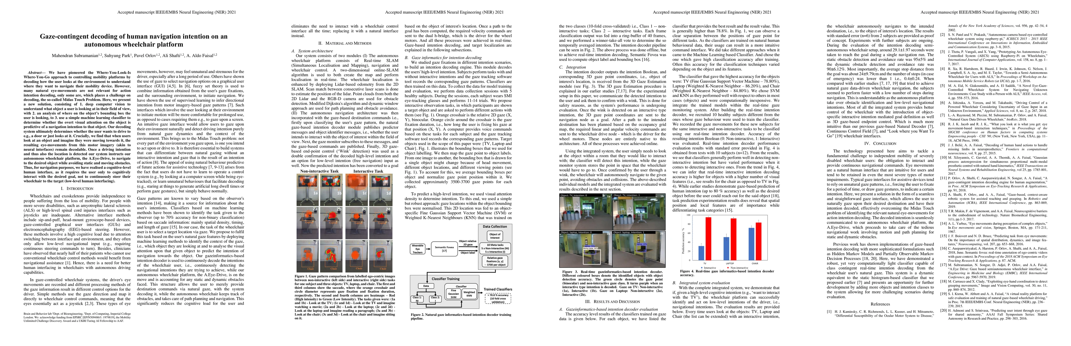 We have pioneered the Where-You-Look-Is Where-You-Go approach to controlling mobility platforms by decoding how the user looks at the environment to understand where they want to navigate their mobility device. However, many natural eye-movements are not relevant for action intention decoding, only some are, which places a challenge on decoding, the so-called Midas Touch Problem. Here, we present a new solution, consisting of 1. deep computer vision to understand what object a user is looking at in their field of view, with 2. an analysis of where on the object's bounding box the user is looking, to 3. use a simple machine learning classifier to determine whether the overt visual attention on the object is predictive of a navigation intention to that object. Our decoding system ultimately determines whether the user wants to drive to e.g., a door or just looks at it. Crucially, we find that when users look at an object and imagine they were moving towards it, the resulting eye-movements from this motor imagery (akin to neural interfaces) remain decodable. Once a driving intention and thus also the location is detected our system instructs our autonomous wheelchair platform, the A.Eye-Drive, to navigate to the desired object while avoiding static and moving obstacles. Thus, for navigation purposes, we have realised a cognitive-level human interface, as it requires the user only to cognitively interact with the desired goal, not to continuously steer their wheelchair to the target (low-level human interfacing).