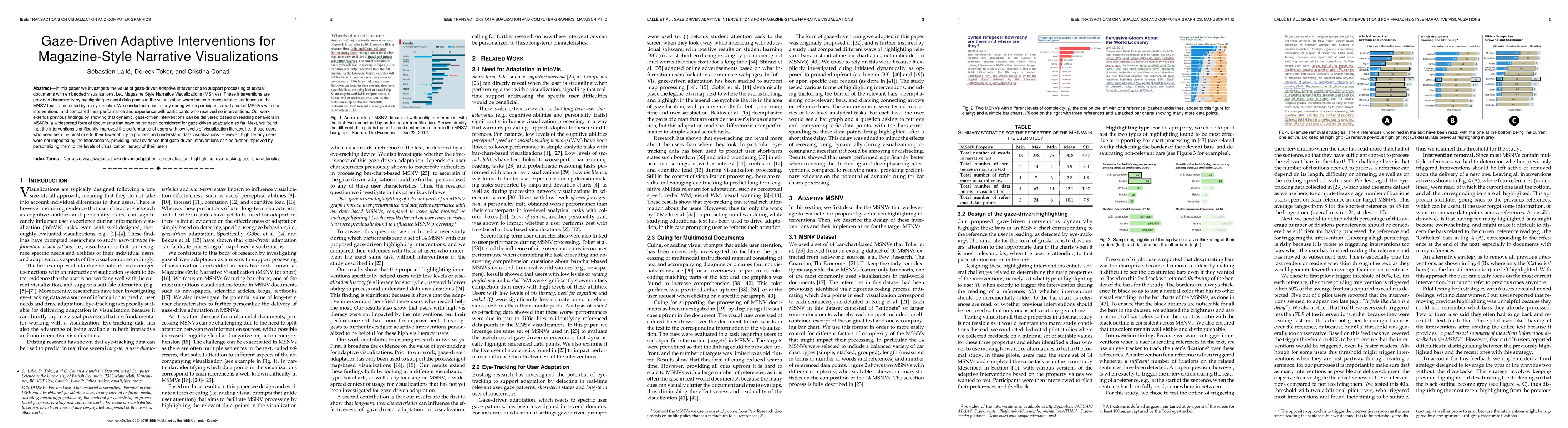In this paper we investigate the value of gaze-driven adaptive interventions to support processing of textual documents with embedded visualizations, i.e., Magazine Style Narrative Visualizations (MSNVs). These interventions are provided dynamically by highlighting relevant data points in the visualization when the user reads related sentences in the MNSV text, as detected by an eye-tracker. We conducted a user study during which participants read a set of MSNVs with our interventions, and compared their performance and experience with participants who received no interventions. Our work extends previous findings by showing that dynamic, gaze-driven interventions can be delivered based on reading behaviors in MSNVs, a widespread form of documents that have never been considered for gaze-driven adaptation so far. Next, we found that the interventions significantly improved the performance of users with low levels of visualization literacy, i.e., those users who need help the most due to their lower ability to process and understand data visualizations. However, high literacy users were not impacted by the interventions, providing initial evidence that gaze-driven interventions can be further improved by personalizing them to the levels of visualization literacy of their users.