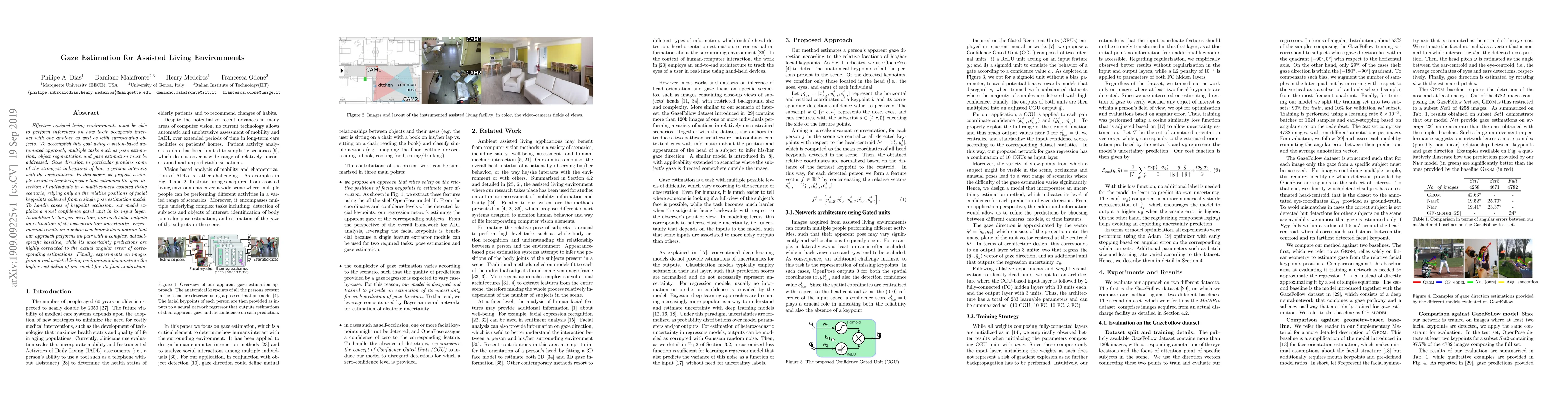 This paper proposes a neural network regressor for estimating gaze direction in assisted living environments using relative facial keypoints from a single pose estimation model. The model includes a confidence gated unit to handle keypoint occlusions and outputs prediction uncertainty, showing comparable performance to complex baselines and suitability for real-world applications.