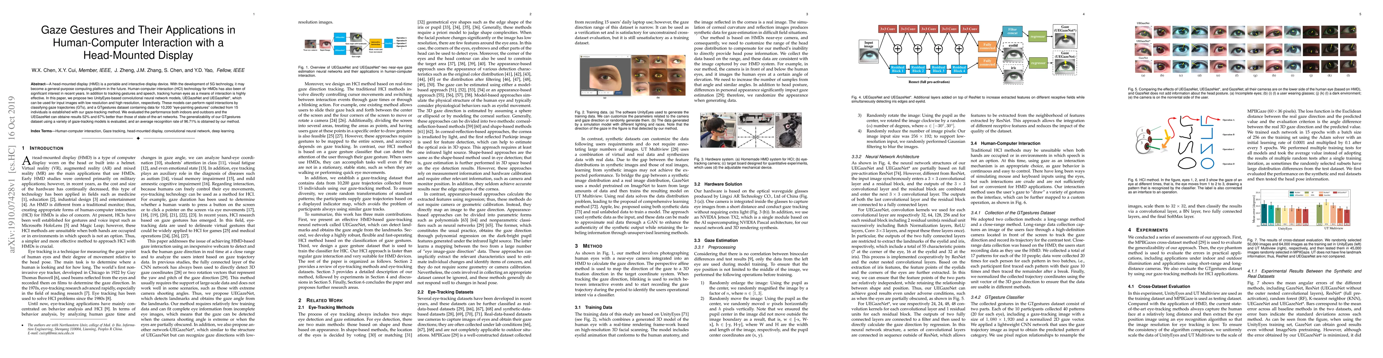A head-mounted display (HMD) is a portable and interactive display device. With the development of 5G technology, it may become a general-purpose computing platform in the future. Human-computer interaction (HCI) technology for HMDs has also been of significant interest in recent years. In addition to tracking gestures and speech, tracking human eyes as a means of interaction is highly effective. In this paper, we propose two UnityEyes-based convolutional neural network models, UEGazeNet and UEGazeNet*, which can be used for input images with low resolution and high resolution, respectively. These models can perform rapid interactions by classifying gaze trajectories (GTs), and a GTgestures dataset containing data for 10,200 "eye-painting gestures" collected from 15 individuals is established with our gaze-tracking method. We evaluated the performance both indoors and outdoors and the UEGazeNet can obtaine results 52\% and 67\% better than those of state-of-the-art networks. The generalizability of our GTgestures dataset using a variety of gaze-tracking models is evaluated, and an average recognition rate of 96.71\% is obtained by our method.