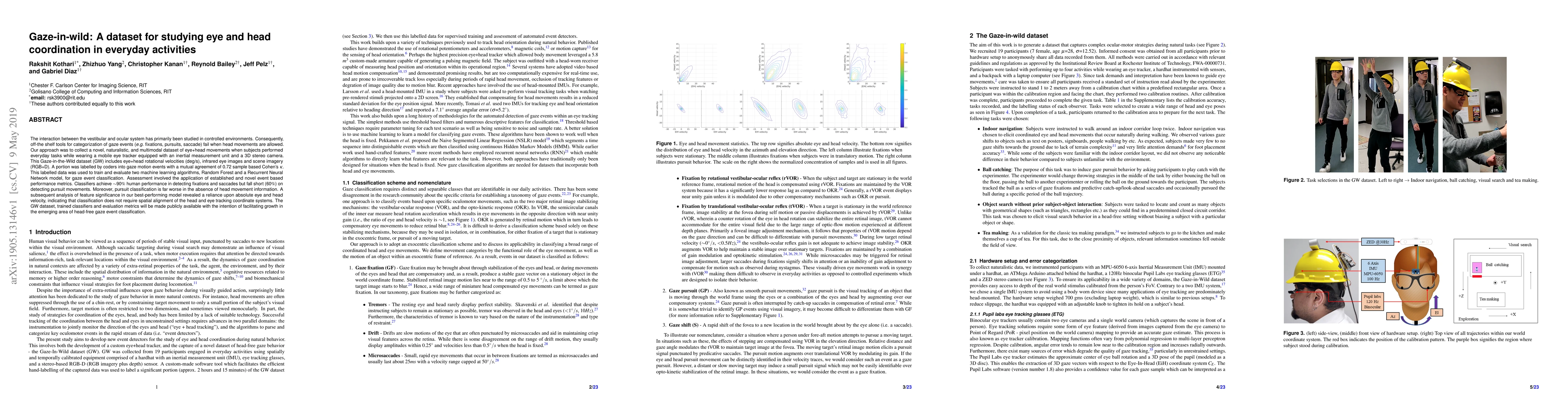 The Gaze-in-the-Wild dataset captures naturalistic eye and head movements during everyday tasks, enabling the study of gaze events without head constraints. Machine learning models achieve near-human performance in classifying fixations and saccades but struggle with pursuit movements, especially without head movement data.