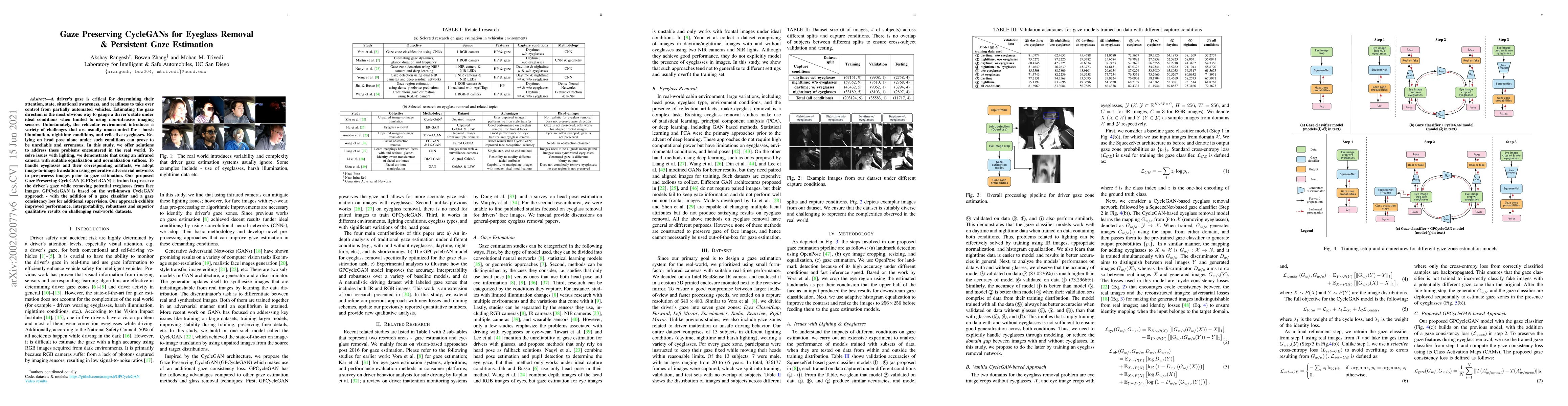 A driver's gaze is critical for determining their attention, state, situational awareness, and readiness to take over control from partially automated vehicles. Estimating the gaze direction is the most obvious way to gauge a driver's state under ideal conditions when limited to using non-intrusive imaging sensors. Unfortunately, the vehicular environment introduces a variety of challenges that are usually unaccounted for - harsh illumination, nighttime conditions, and reflective eyeglasses. Relying on head pose alone under such conditions can prove to be unreliable and erroneous. In this study, we offer solutions to address these problems encountered in the real world. To solve issues with lighting, we demonstrate that using an infrared camera with suitable equalization and normalization suffices. To handle eyeglasses and their corresponding artifacts, we adopt image-to-image translation using generative adversarial networks to pre-process images prior to gaze estimation. Our proposed Gaze Preserving CycleGAN (GPCycleGAN) is trained to preserve the driver's gaze while removing potential eyeglasses from face images. GPCycleGAN is based on the well-known CycleGAN approach - with the addition of a gaze classifier and a gaze consistency loss for additional supervision. Our approach exhibits improved performance, interpretability, robustness and superior qualitative results on challenging real-world datasets.