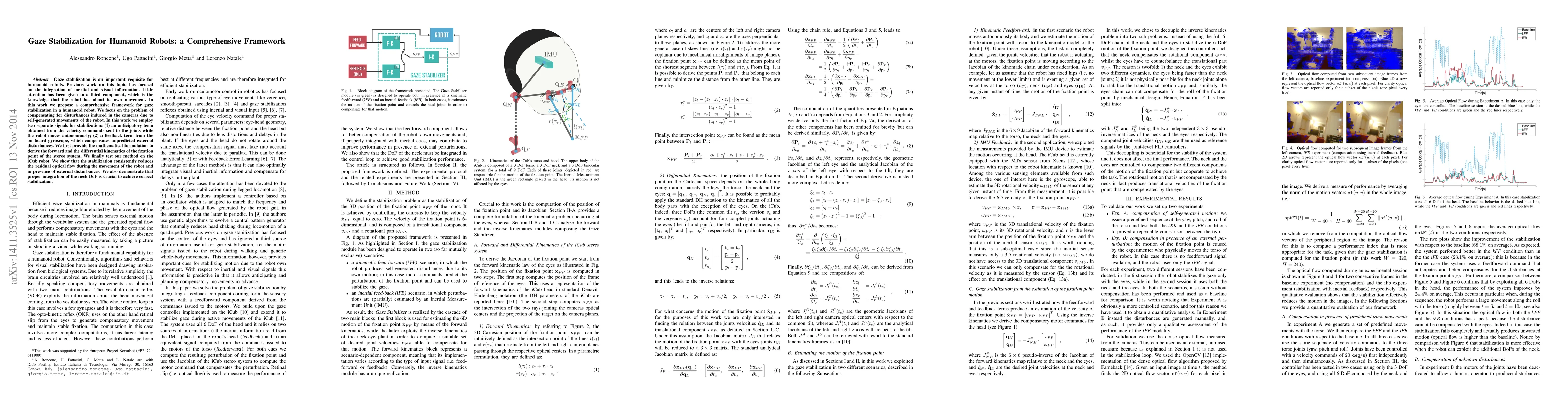 Gaze stabilization is an important requisite for humanoid robots. Previous work on this topic has focused on the integration of inertial and visual information. Little attention has been given to a third component, which is the knowledge that the robot has about its own movement. In this work we propose a comprehensive framework for gaze stabilization in a humanoid robot. We focus on the problem of compensating for disturbances induced in the cameras due to self-generated movements of the robot. In this work we employ two separate signals for stabilization: (1) an anticipatory term obtained from the velocity commands sent to the joints while the robot moves autonomously; (2) a feedback term from the on board gyroscope, which compensates unpredicted external disturbances. We first provide the mathematical formulation to derive the forward and the differential kinematics of the fixation point of the stereo system. We finally test our method on the iCub robot. We show that the stabilization consistently reduces the residual optical flow during the movement of the robot and in presence of external disturbances. We also demonstrate that proper integration of the neck DoF is crucial to achieve correct stabilization.